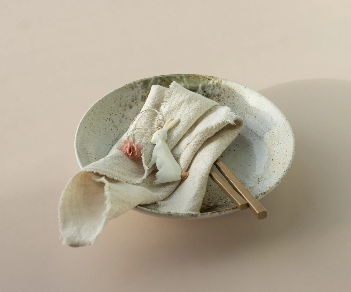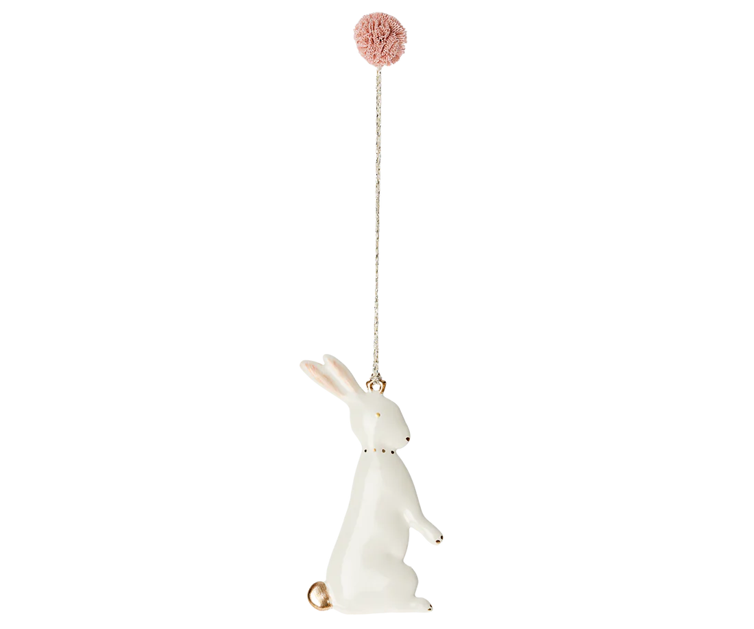 Adorno de conejito de Pascua en metal con detalles pintados a mano y un pequeño pompón de rosa.