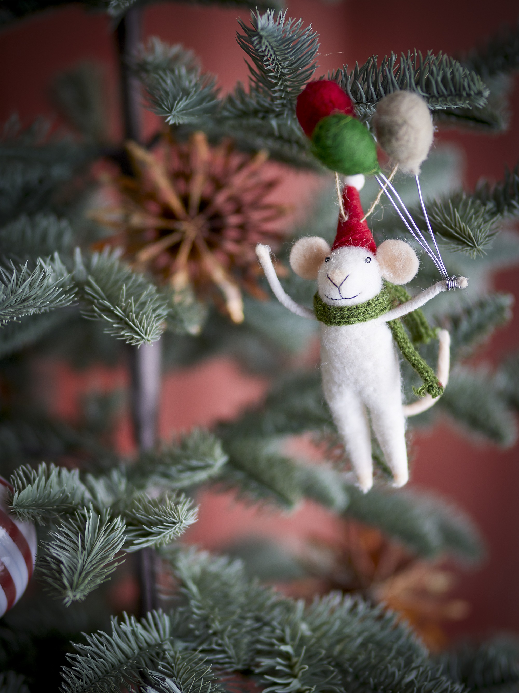 Es adorno navideño de Bloomingville presenta un encantador ratón, fieltrado en suave lana y adornado con un gorro de Papá Noel, una bufanda verde y globos de colores.