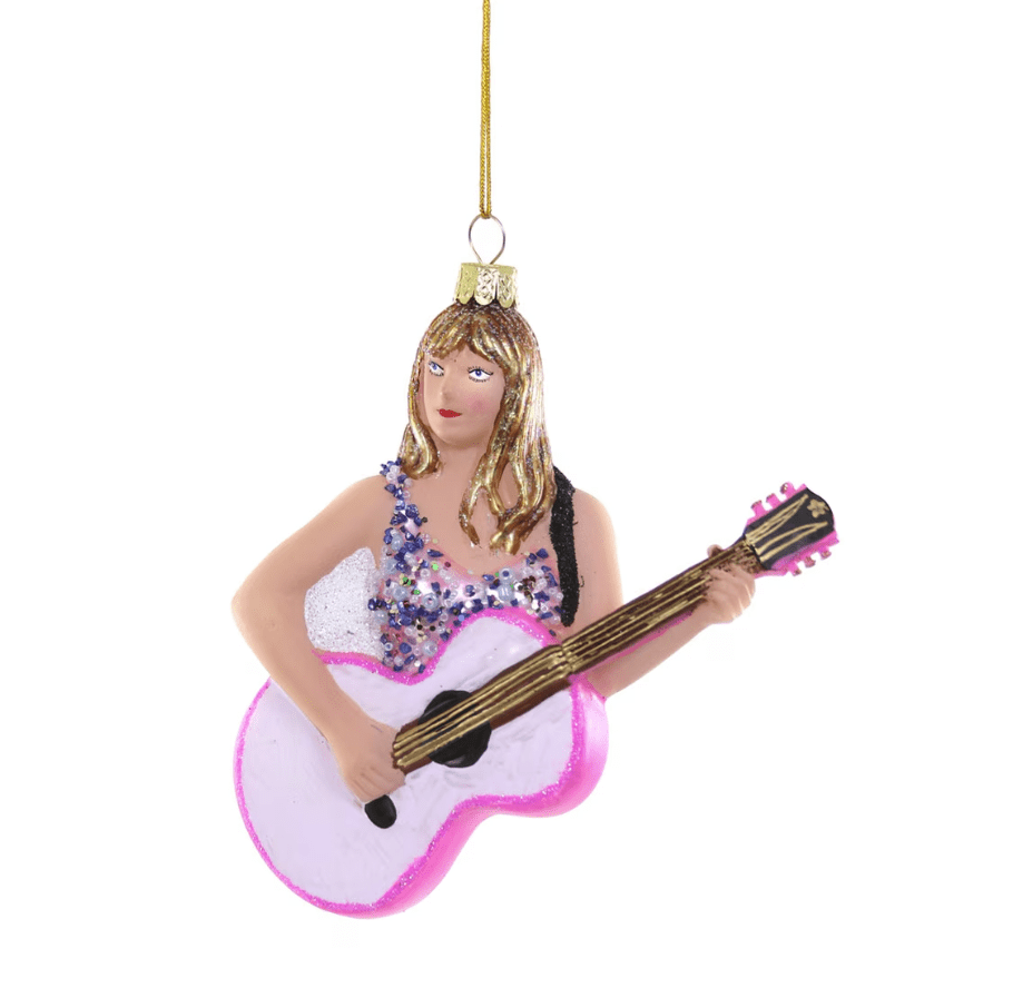 Este adorno de vidrio captura la energía escénica de Taylor Swift en pleno The Eras Tour, con su guitarra rosa y un body cubierto de pedrería que brilla incluso en su versión miniatura. El nivel de detalle convierte la pieza en un pequeño símbolo de espectáculo y dedicación artística.