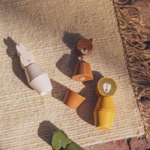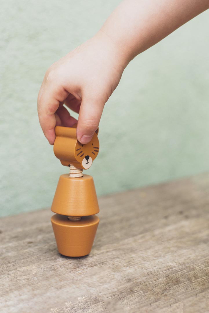 El juego contiene 4 animales diferentes. Los animales de tornillo están hechos de madera 100% certificada FSC®. Todas las pinturas de este producto son a base de agua, seguras para los niños y no tóxicas.