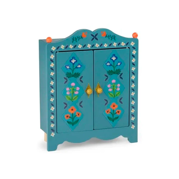 Un pequeño tesoro lleno de encanto para el juego simbólico. Este armario de madera azul pintado a mano destaca por sus delicadas flores de inspiración folk de la colección minouchkas de Moulin Roty.