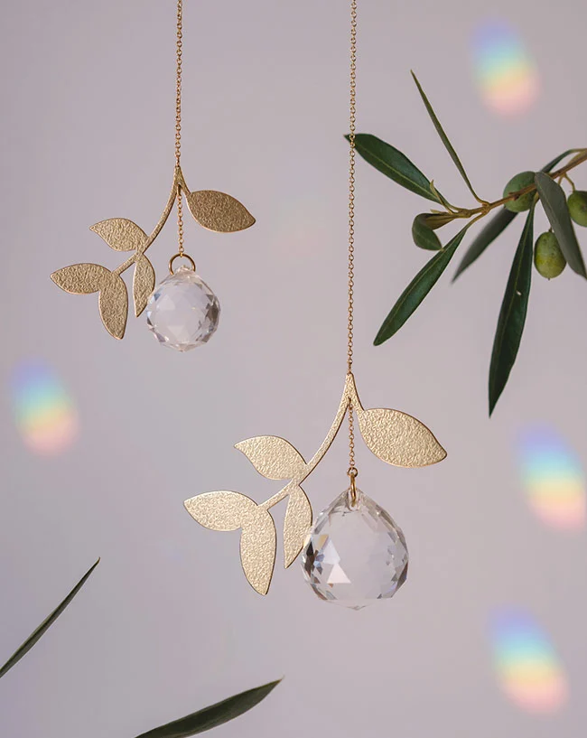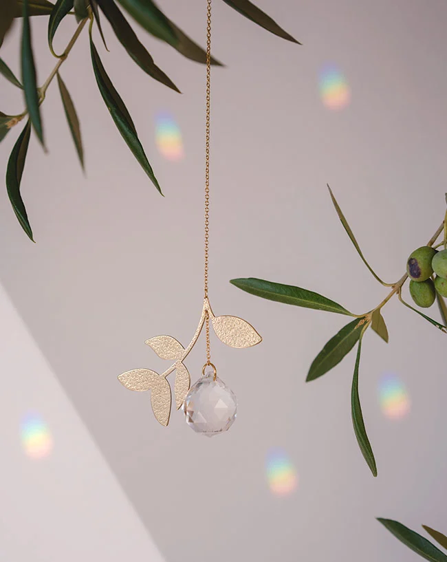 El largo total del atrapaluces es de 26cm para que puedas colgarlo. La bola de cristal mide 20x25mm de diámetro. La rama de olivo mide 60x50mm.