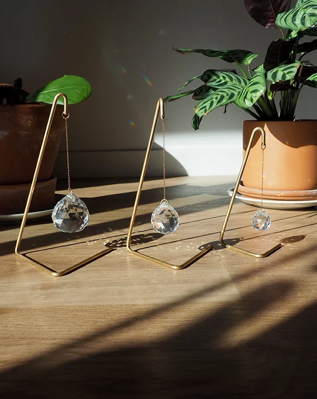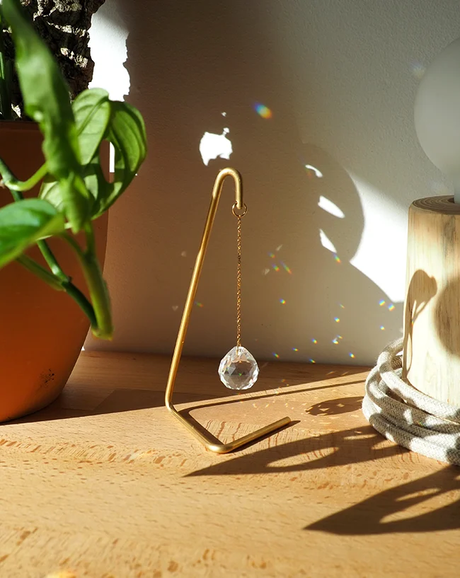Te presentamos el Atrapaluces Prisma, creado para invocar equilibrio y belleza. Cada rayo que toca su cristal es una invitación a la calma, al fluir natural de la energía en tu hogar.