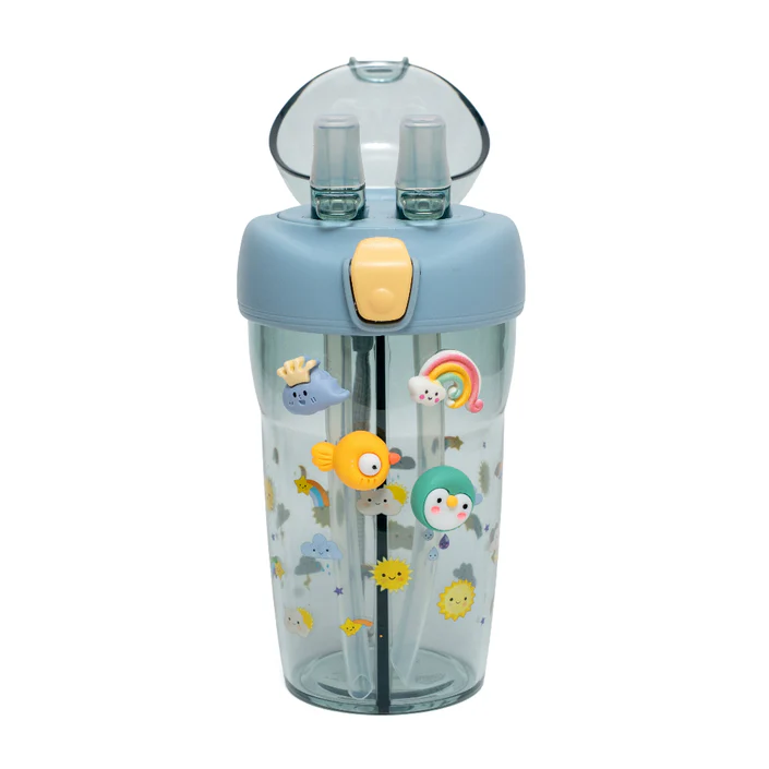 Estampado de cielo y pegatinas de silicona 3D de arcoiris, peces, nubes y pingüino, que se pueden colocar en la botella o en la tapa.