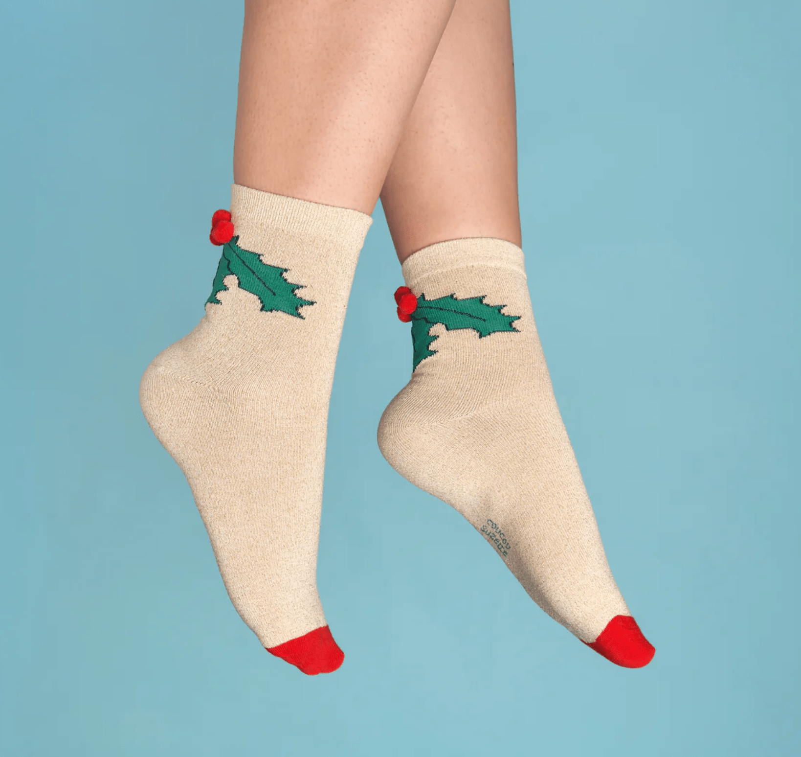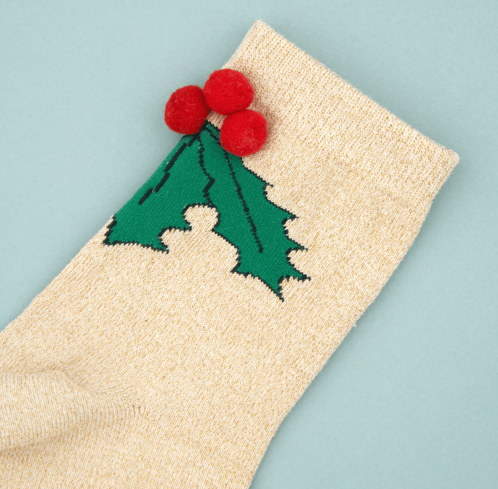 Lucen un motivo de acebo justo encima del tobillo y divertidos pompones.
