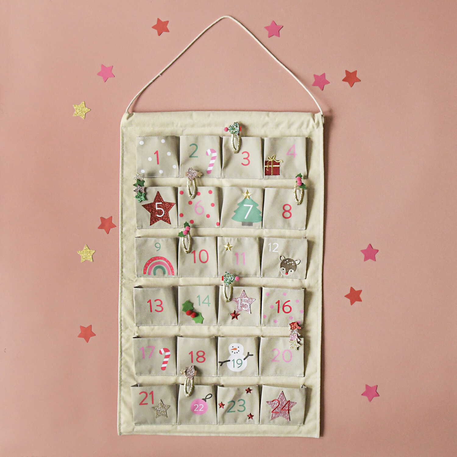Este magnífico calendario de adviento reutilizable tiene 24 bolsillos espaciosos listos para llenar con dulces, golosinas, pequeños juguetes y muchos clips o gomas de Rockahula!