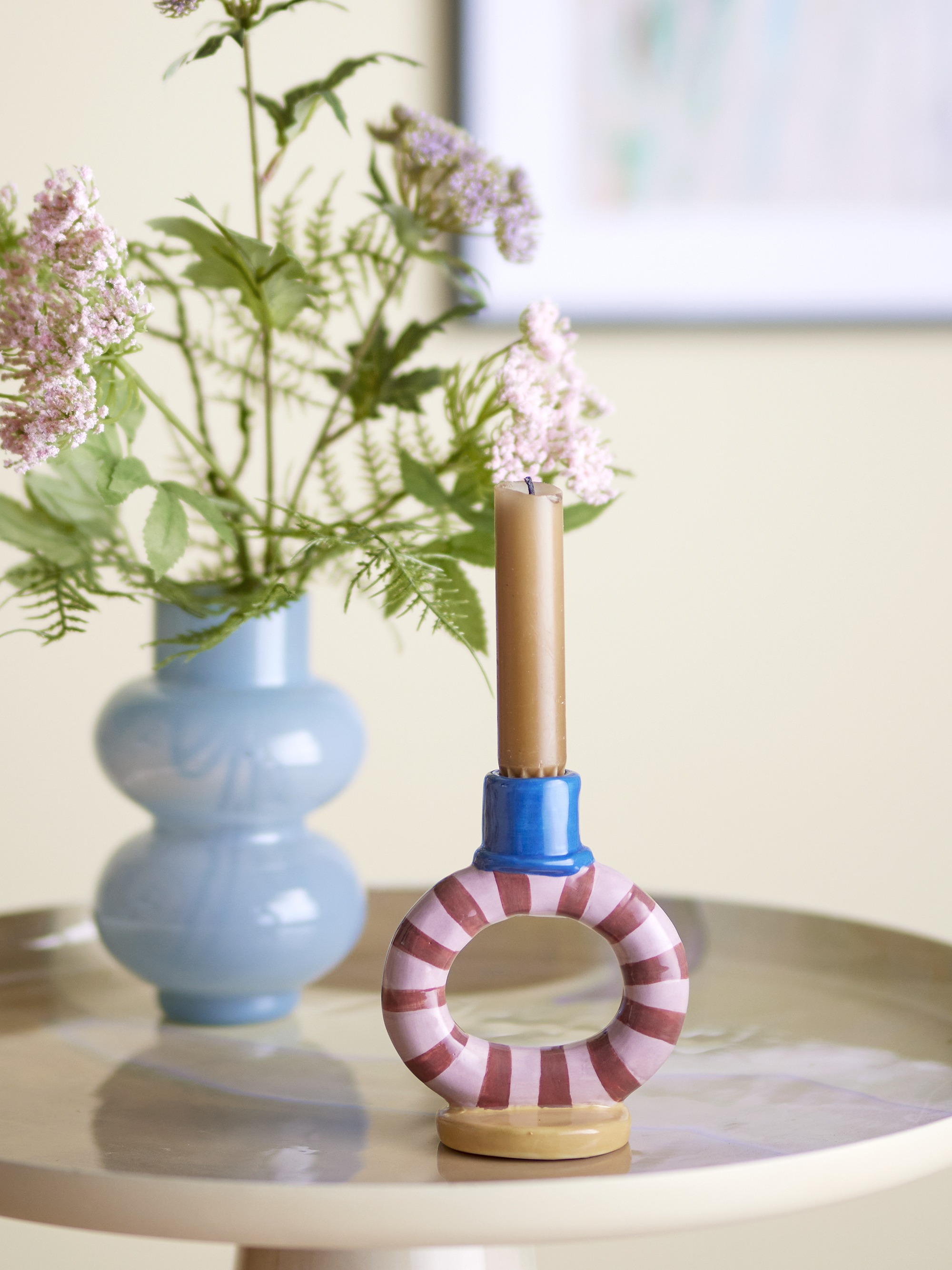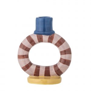 Hecho de gres con un esmaltado brillante y multicolor, este candelabro es una de nuestras piezas favoritas.