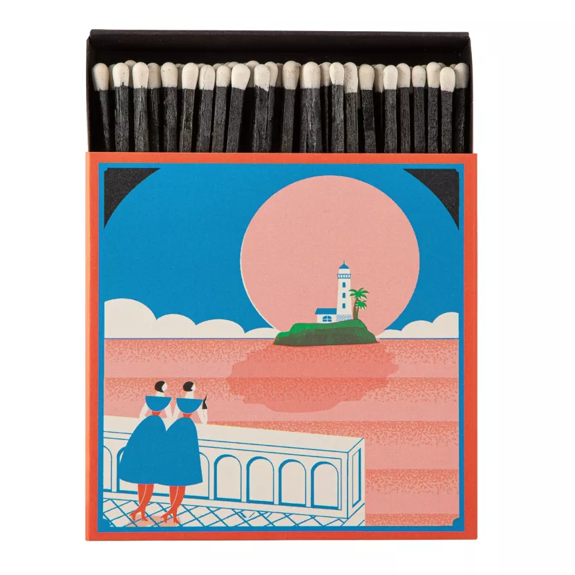 Nuestra exclusiva caja de cerillas cuadrada presenta a dos mujeres mirando hacia un faro con una puesta de sol rosa. Diseñado por Yukiko Kata.