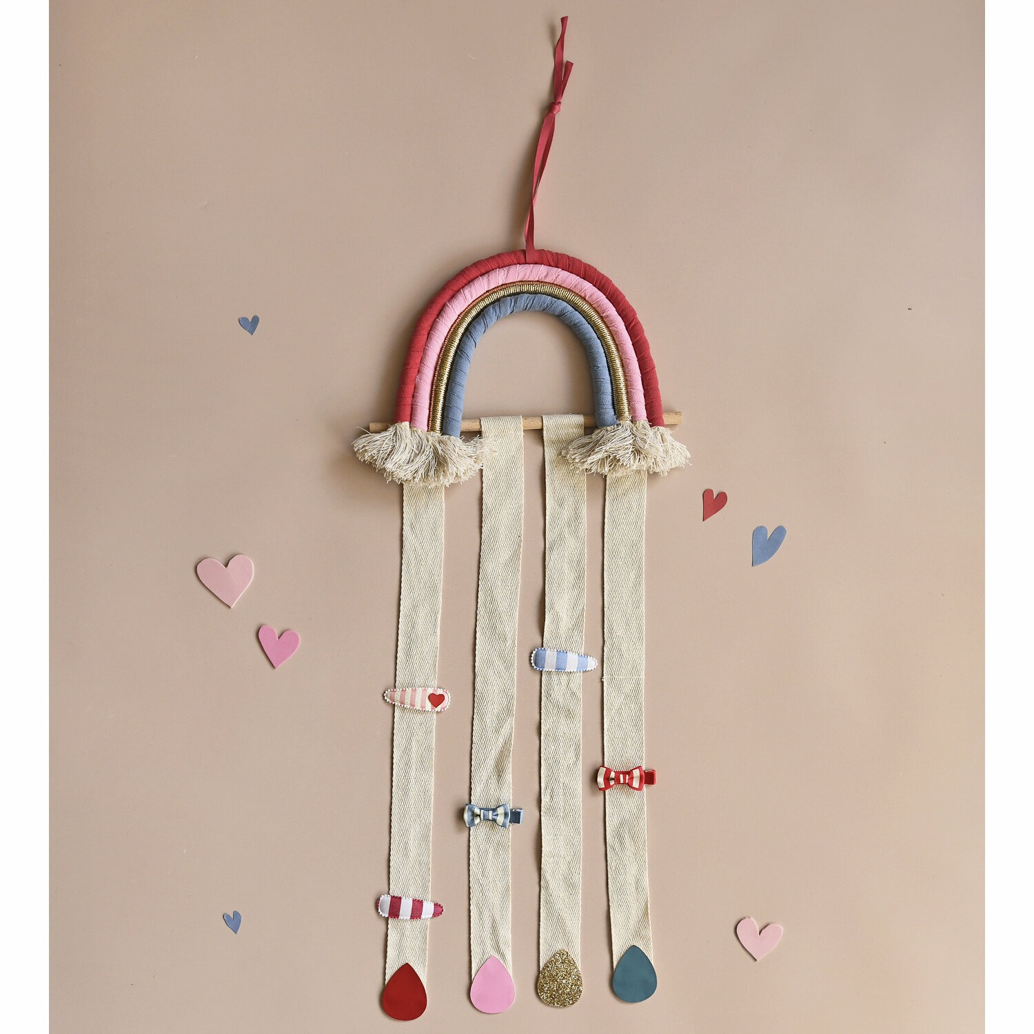 Con un precioso arcoíris de tela en colores brillantes y cuatro tiras para colgar sujetas a una barra de madera, nuestra percha con forma de gotas de arcoíris tiene capacidad para unas 52 pinzas (según el tamaño) y se cuelga perfectamente de una cinta de grosgrain.