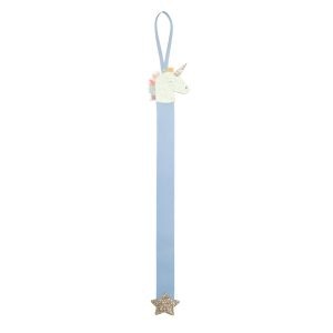 Hecho de purpurina blanca brillante con crin de color y cuerno dorado. Tiene capacidad para unos 12 clips (según el tamaño) y se cuelga perfectamente de una cinta de grosgrain. *¡Clips no incluidos!