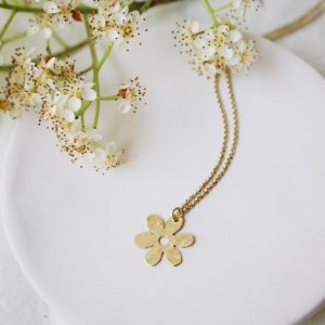 La flor mide 12mm y va acompañada de una cadenita fina de 42cm de latón chapado en oro de 18kt, libre de tóxicos como el níquel o el plomo.