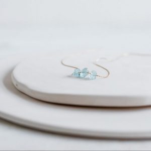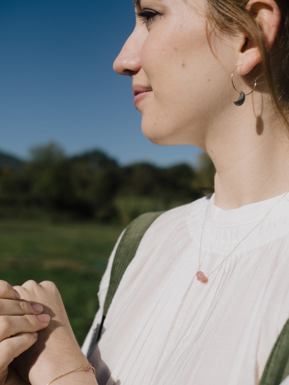 Para su diseño hemos empleado pequeños fragmentos de mineral en bruto de aspecto rústico que contrastan con la delicadeza de la cadenita en la que van engarzados.