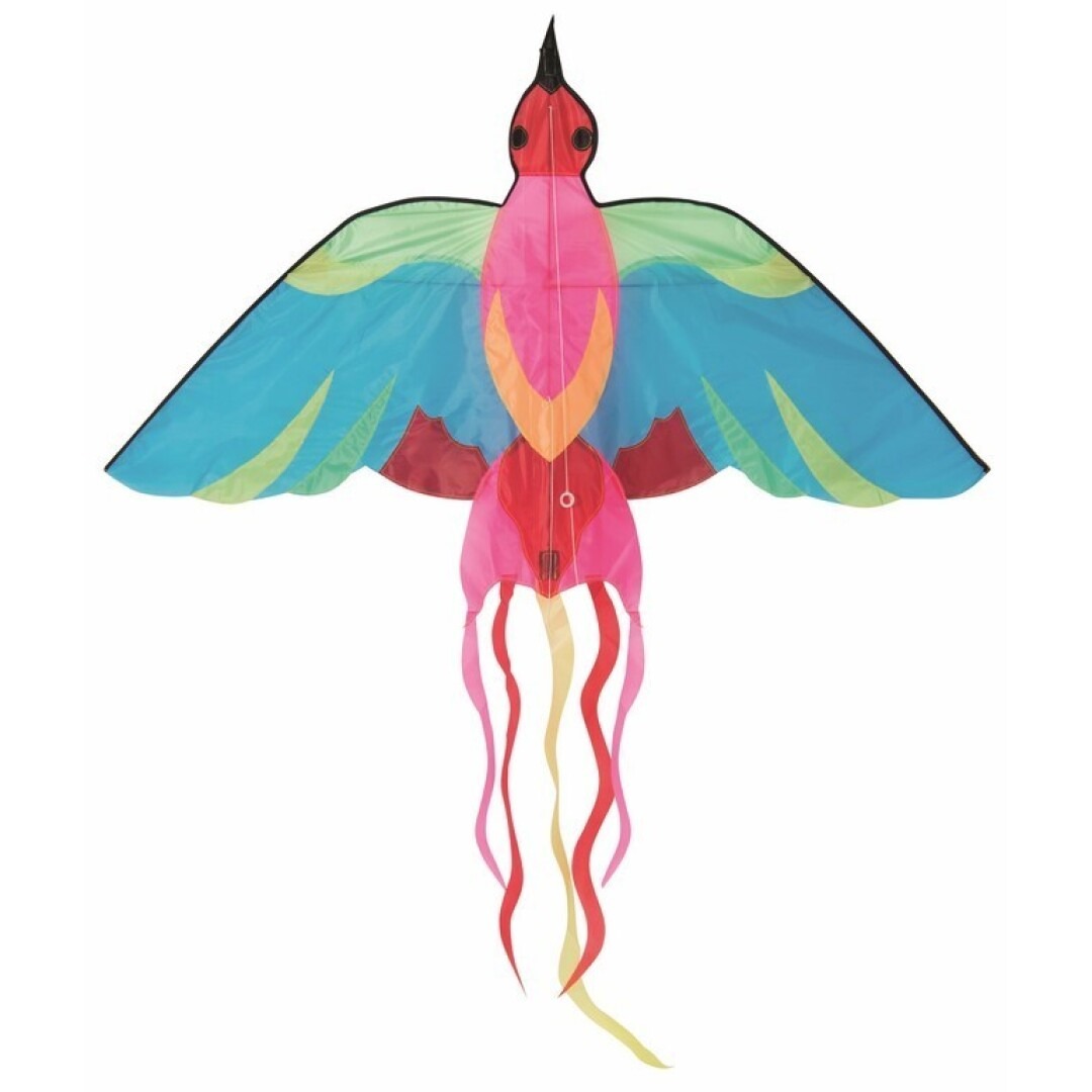 Precioso cometa en forma de pájaro, con largas cintas que bailan en el aire. Con un colorido que no pasará desapercibido.
