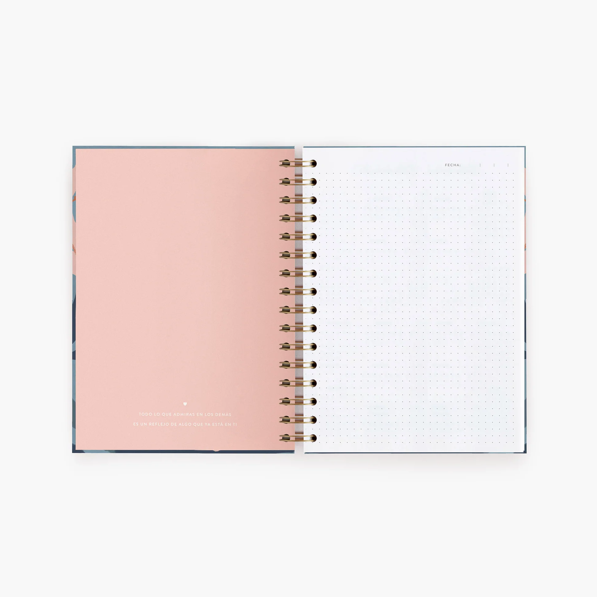 Cuaderno en tamaño A5. Pégale tickets, fotos y recuerdos y se convertirá en tu diario. El interior es de puntitos, la impresión es suave para que puedas utilizarlo para escribir o dibujar.
