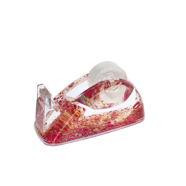Un dispensador de celo transparente con purpurina rosa y verde neón.
