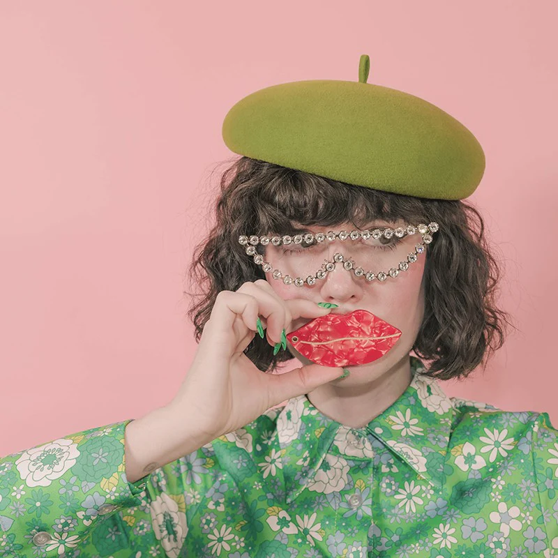 Un pequeño espejo de bolsillo con forma de boca roja perfectamente deliciosa en acetato de estilo retro.