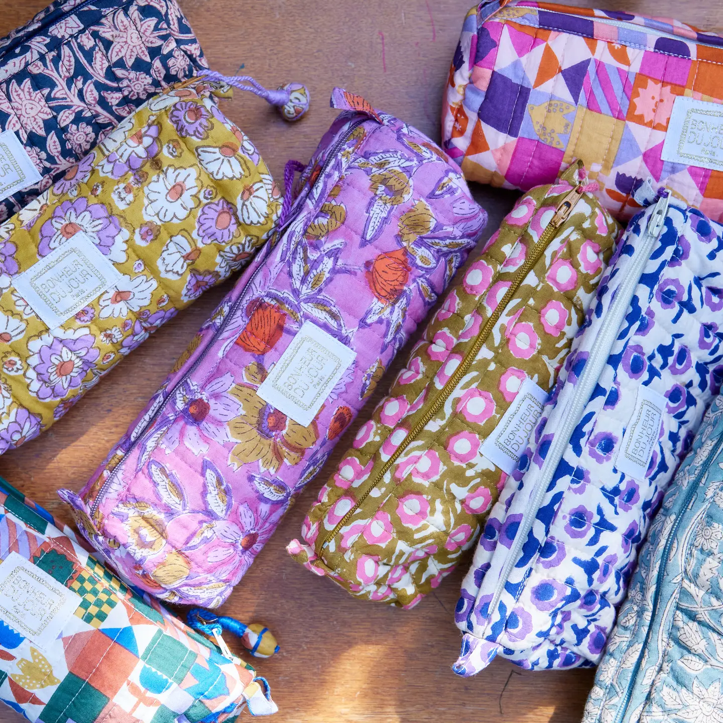 Impreso a mano con sellos de madera mediante la técnica artesanal de impresión en bloque, cada estuche cuenta una historia. Nos encantan sus colores suaves, su tela afelpada y su bonito pompón hecho con la misma tela.