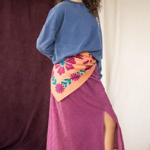 Está confeccionada a mano utilizando la técnica india del estampado en bloque. Sus colores están elaborados a partir de pigmentos naturales. Esta producción manual puede dar lugar a ciertas “irregularidades” cuyo encanto nos encanta ♡