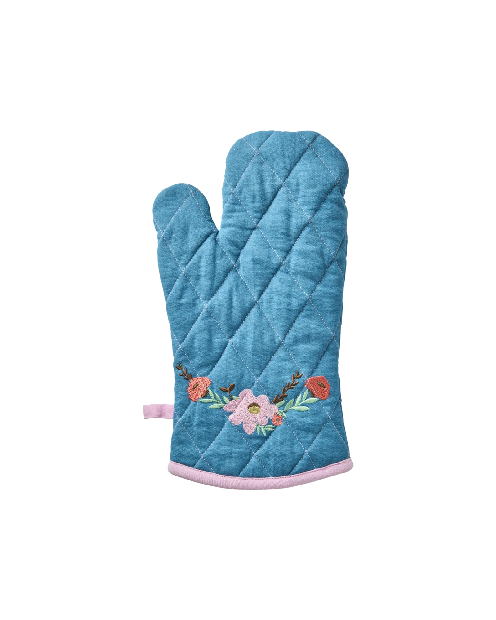 Bonita manopla de horno de color azul con un diseño de flores y detalles rosas – ¡seguro que hará que cocinar sea más divertido!