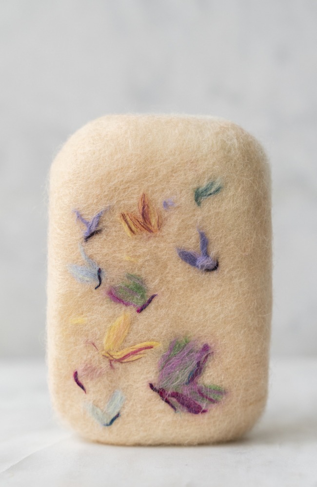 Jabón artesanal de aceite de oliva y aceite de coco 100% prensado en frio, recubierto de lana de oveja afieltrada a mano.