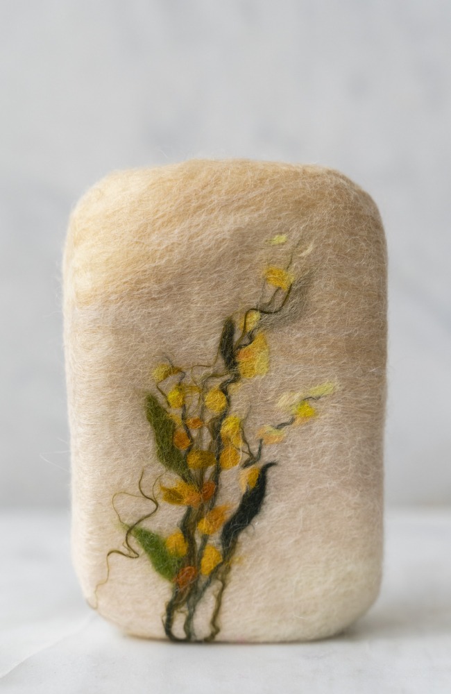 Jabón artesanal de aceite de oliva y aceite de coco 100% prensado en frio, recubierto de lana de oveja afieltrada a mano.
