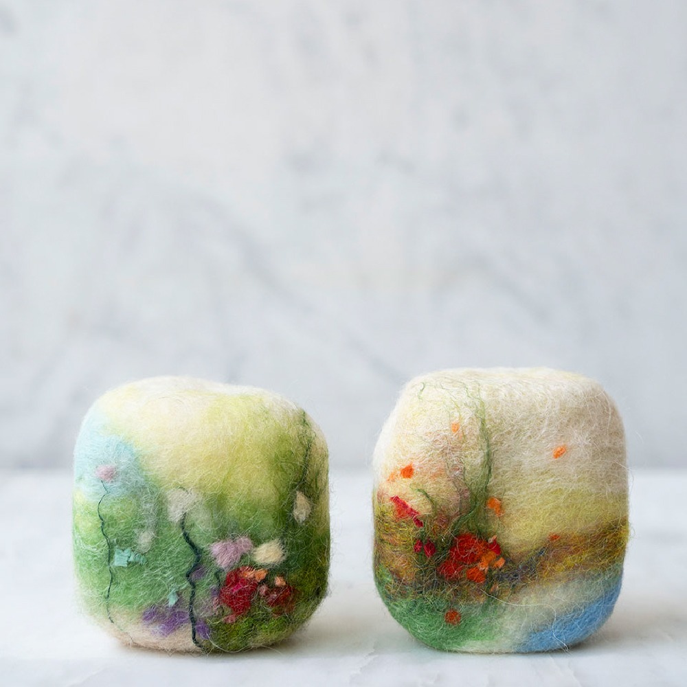 Dos pequeñas piezas de jabón artesanal de aceite de oliva y aceite de coco 100% prensado en frio, recubierto de lana de oveja afieltrada a mano.