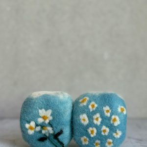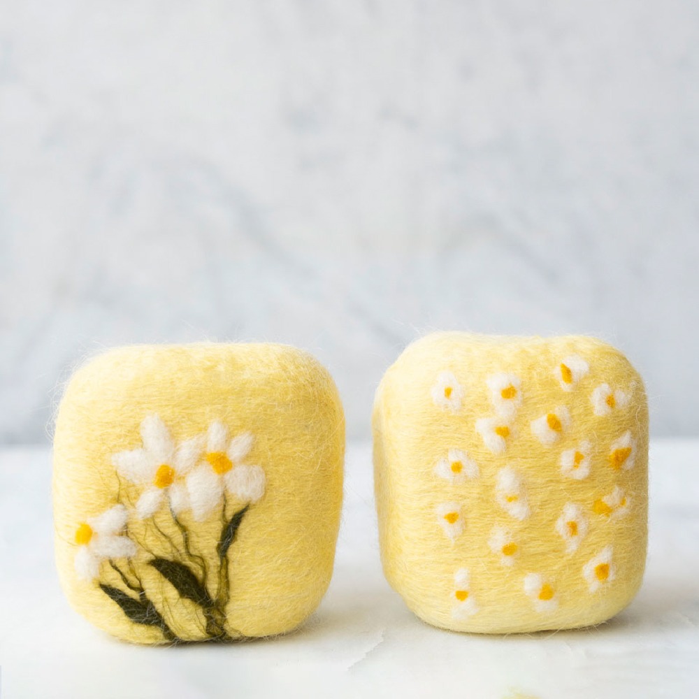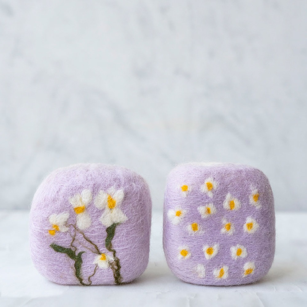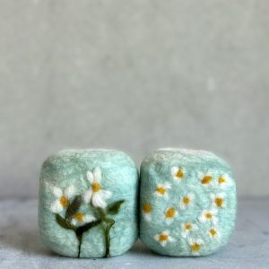 Dos pequeñas piezas de jabón artesanal de aceite de oliva y aceite de coco 100% prensado en frio, recubierto de lana de oveja afieltrada a mano.