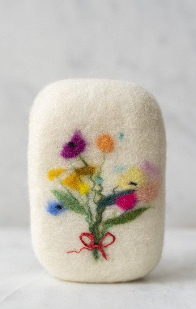 Jabón artesanal de aceite de oliva y aceite de coco 100% prensado en frio, recubierto de lana de oveja afieltrada a mano.