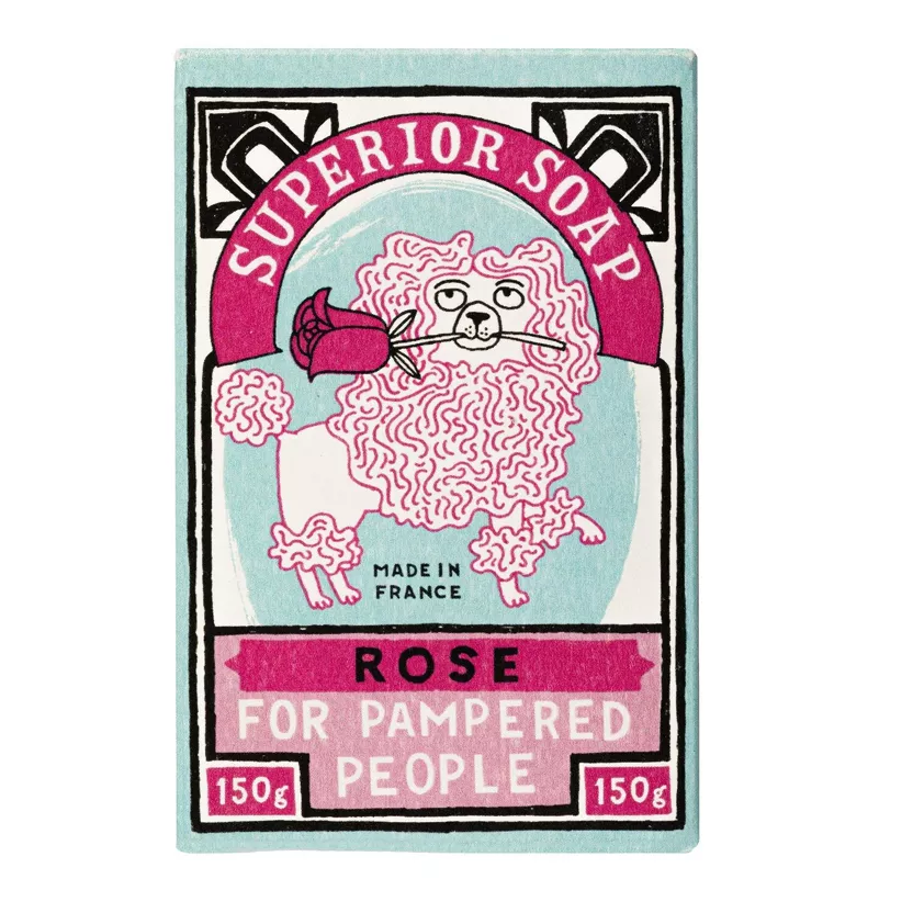 Este jabón rosa con aroma a rosas Savon d’Archivist, grabado con un caniche, viene en un atrevido empaque decorativo en rosa y azul que presenta un caniche gruñón.