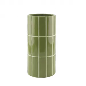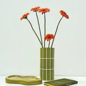 Este jarrón de cerámica destaca por su original efecto de azulejo y su color verde, aportando un toque de elegancia y personalidad a cualquier ambiente. Una pieza decorativa que realza tus flores o brilla por sí sola.