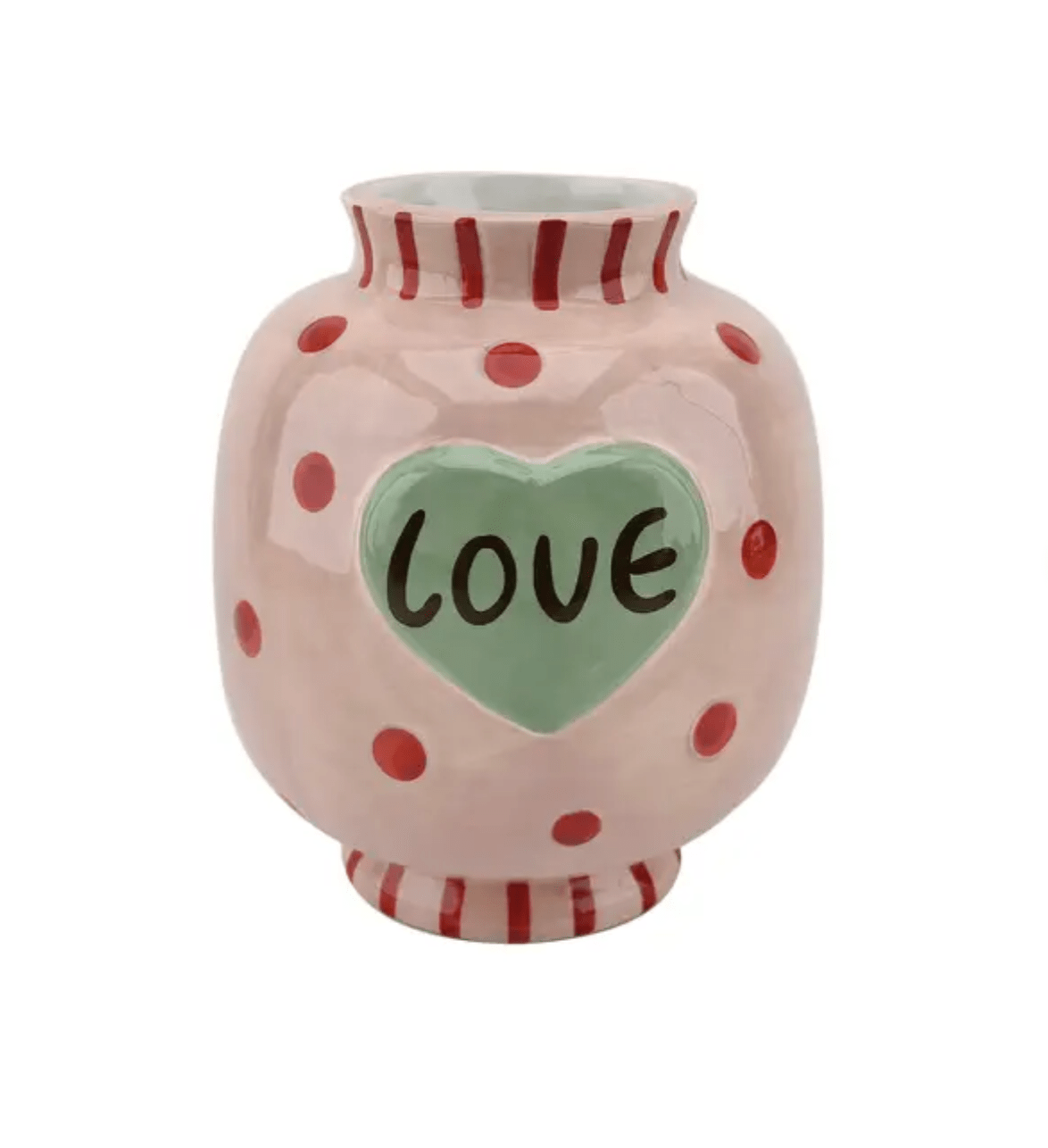 El jarrón Love encarna una decoración suave, alegre y emotiva. Fabricado en loza vidriada , se distingue por su núcleo central delicadamente coloreado, su mensaje LOVE pintado y sus estampados gráficos de lunares y rayas.