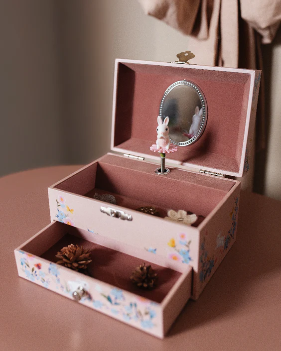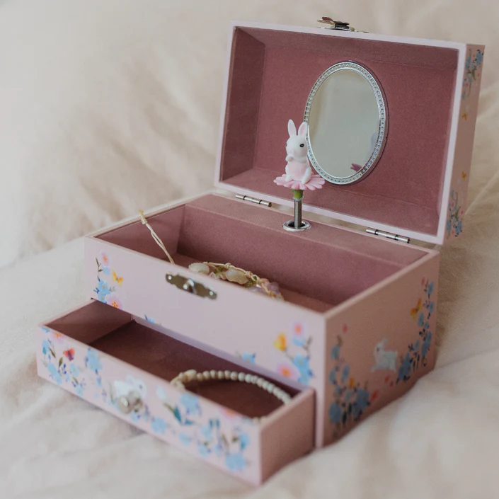 Un maravilloso joyero musical con un conejito blanco y un espejo ovalado en su interior.