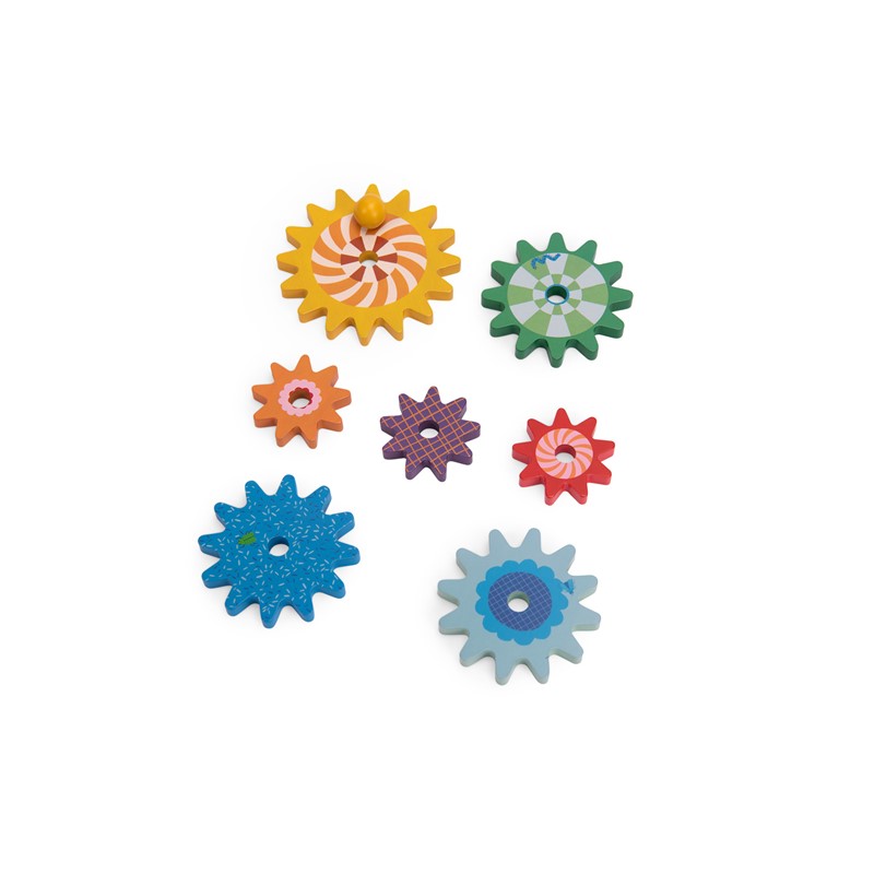 Al colocar todas las piezas del engranaje y hacer girar la rueda, produce un efecto en el resto de piezas que también giran a la vez.