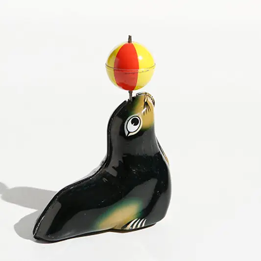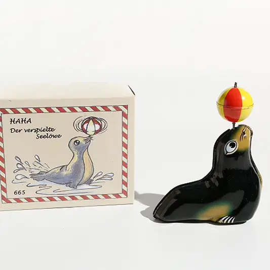 Después de dar cuerda con la llave de cuerda incluida en la entrega, el león marino recorre la mesa y la bola gira sobre su hocico.