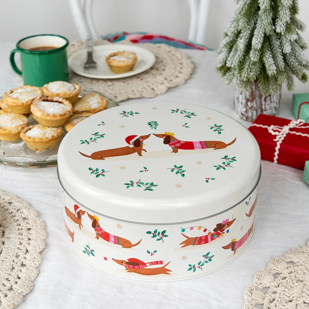 Lata redonda para guardar pasteles, con la imagen de nuestro adorable perrito salchicha en una variedad de atuendos y escenas festivas.