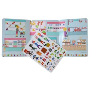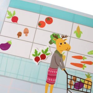 Compuesto por 42 pequeñas pegatinas de silicona, el libro Mi Pequeño Mercado ayudará a los niños a contar y reconocer frutas, verduras, personajes e ingredientes cotidianos. Simplemente colóquelas en los lugares correspondientes de la imagen o en el libro, sobre las sombras de los elementos.