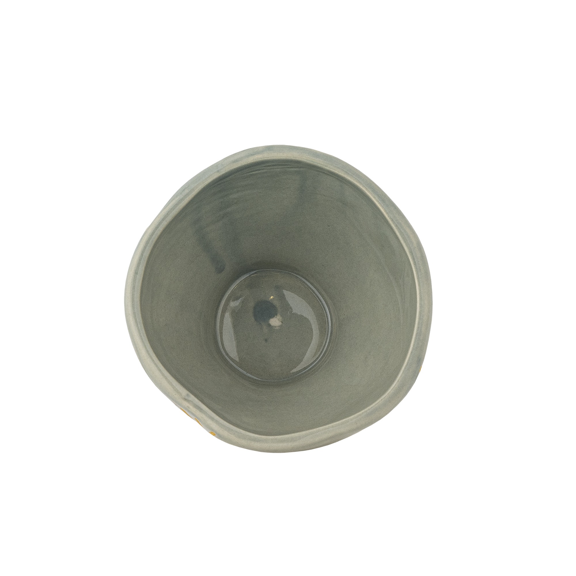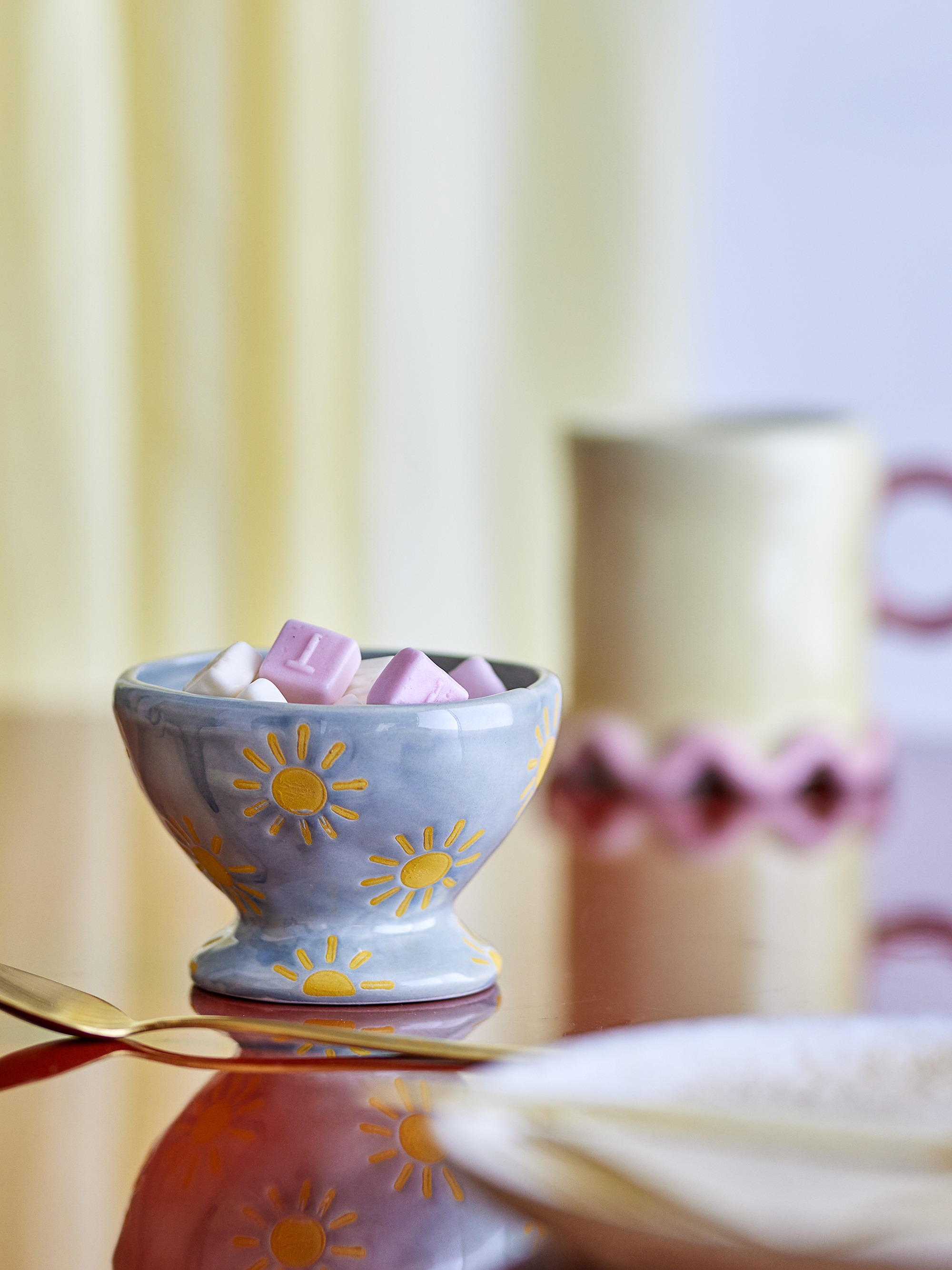 El cuenco Nini de Bloomingville está elaborado en gres con un acabado pintado a mano en un azul suave, con motivos de soles amarillos, una base curva y un borde ligeramente irregular.