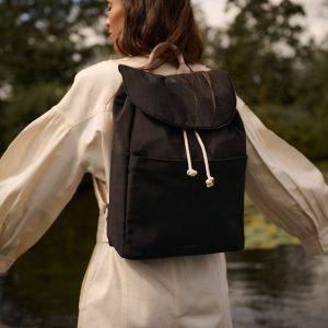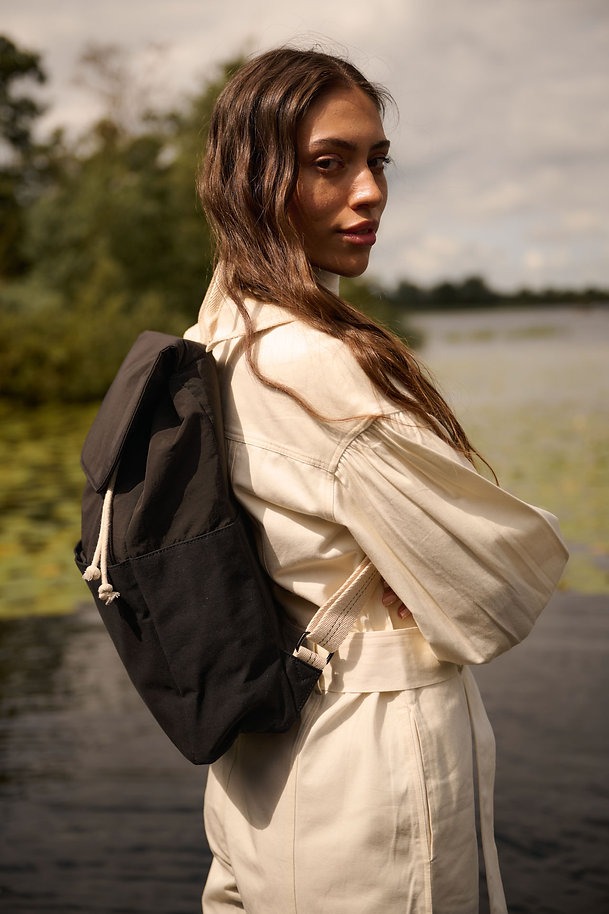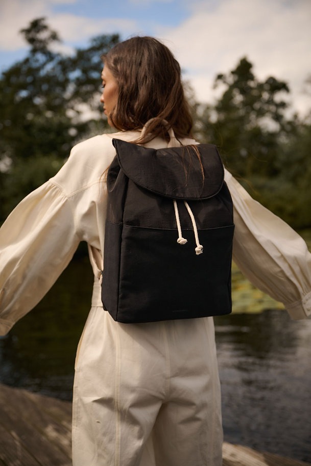 Una mochila nueva y mejorada, confeccionada en nailon arrugado y lona, ​​con cordón ajustable para guardar todas tus pertenencias de forma segura.