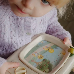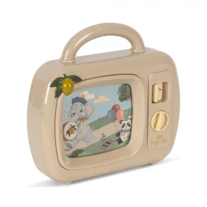 My Melody TV es un encantador televisor musical diseñado especialmente para los más pequeños. Al girar el botón en sentido contrario a las agujas del reloj, la pantalla cobra vida con dulces imágenes en movimiento que acompañan una suave melodía relajante.
