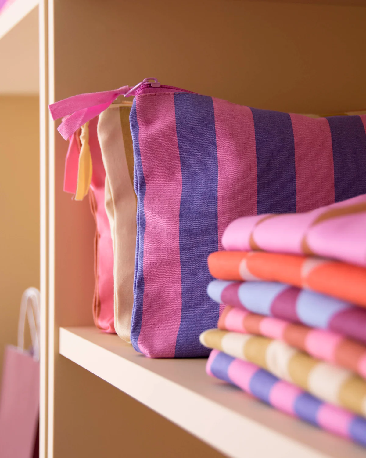 Neceser de algodón con estampado de rayas verticales.