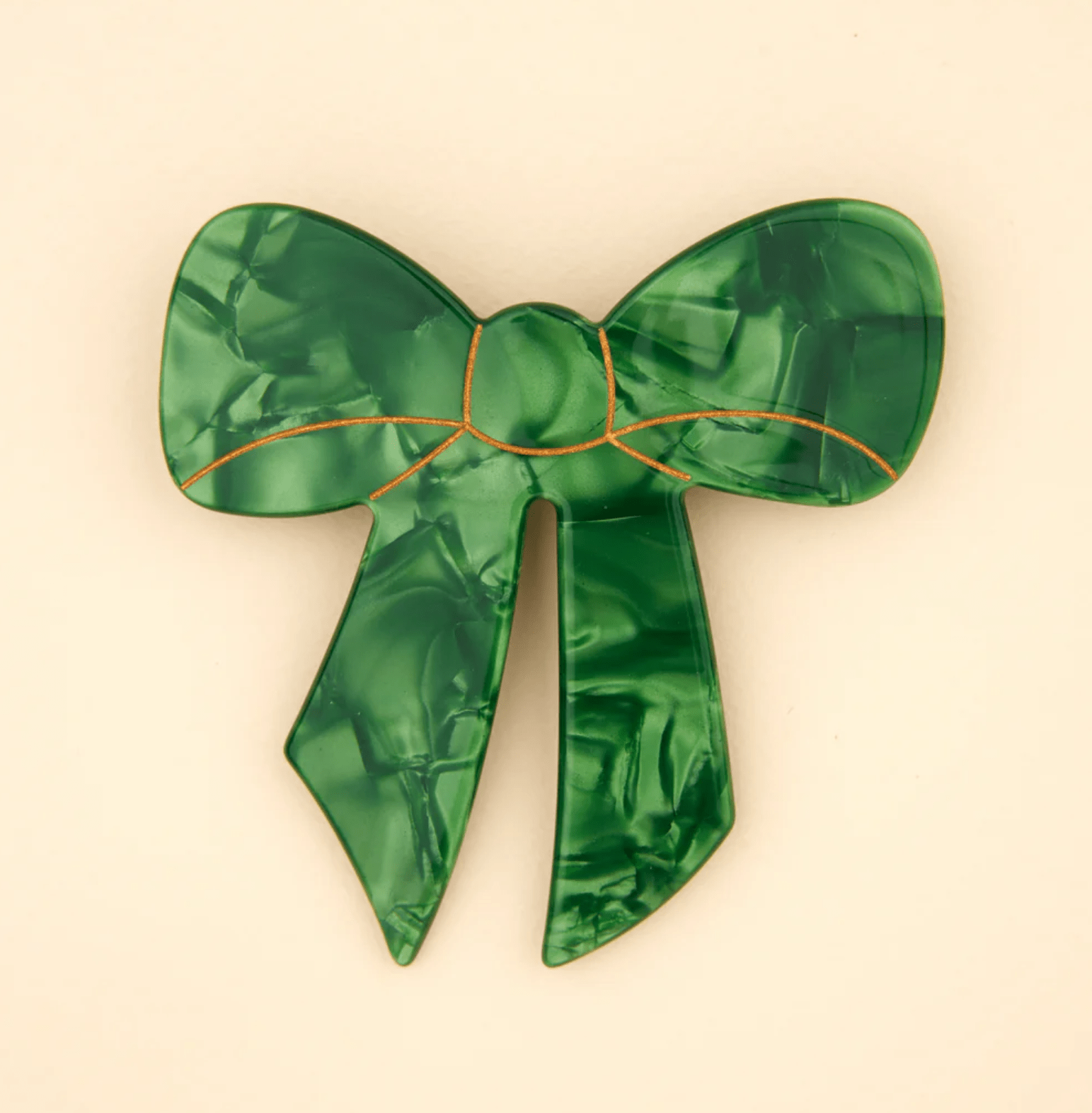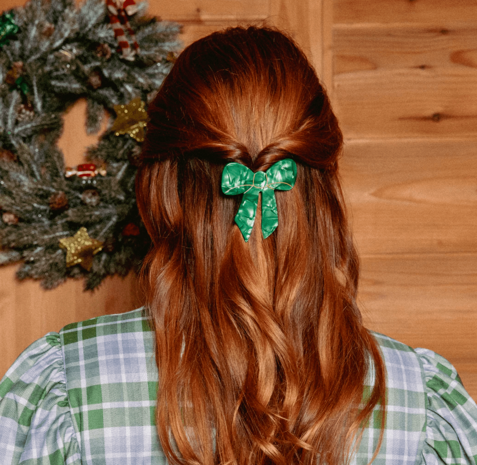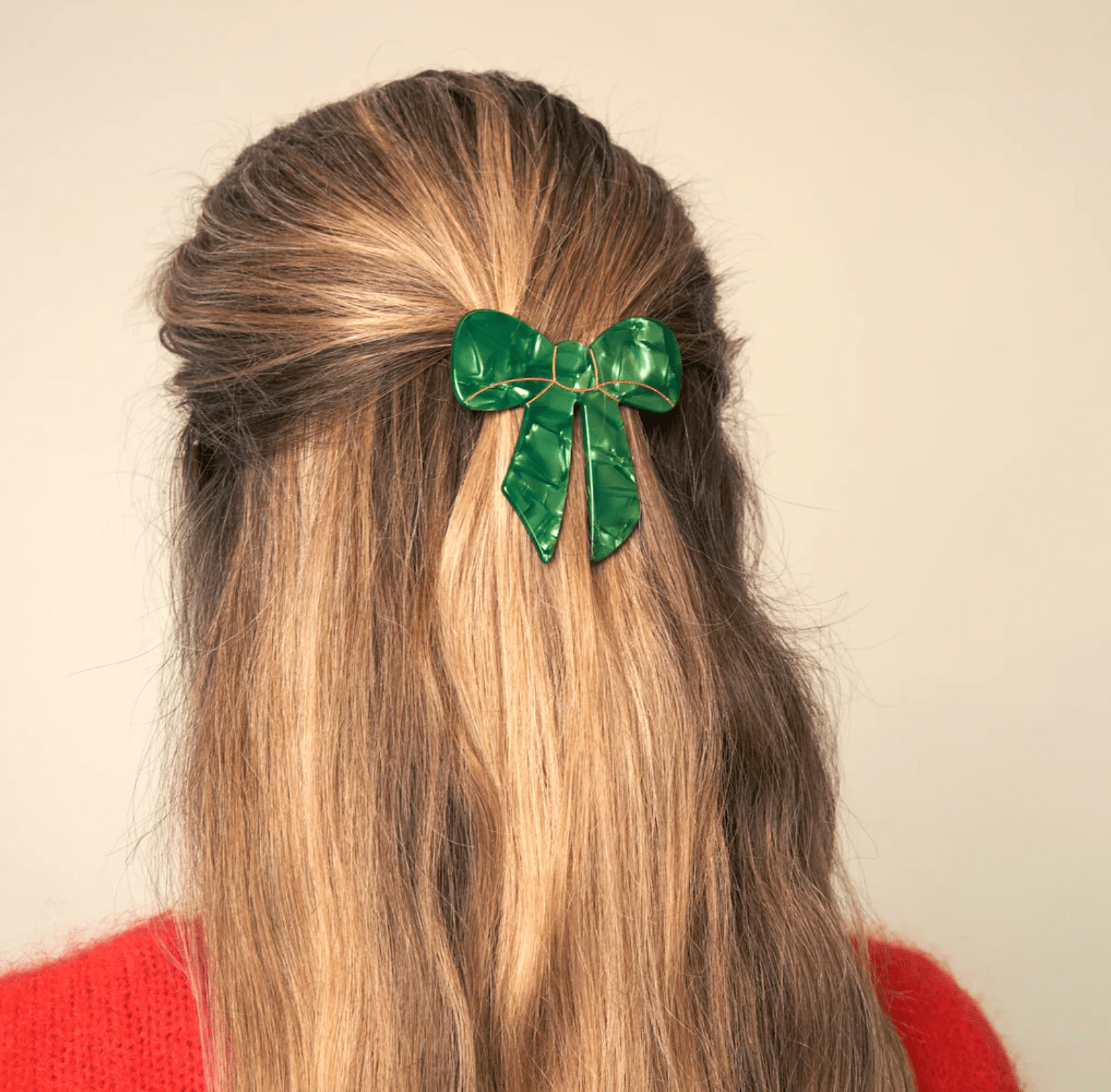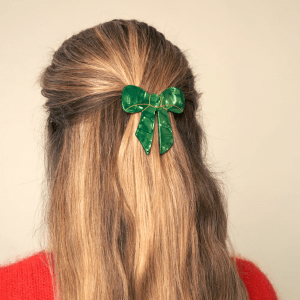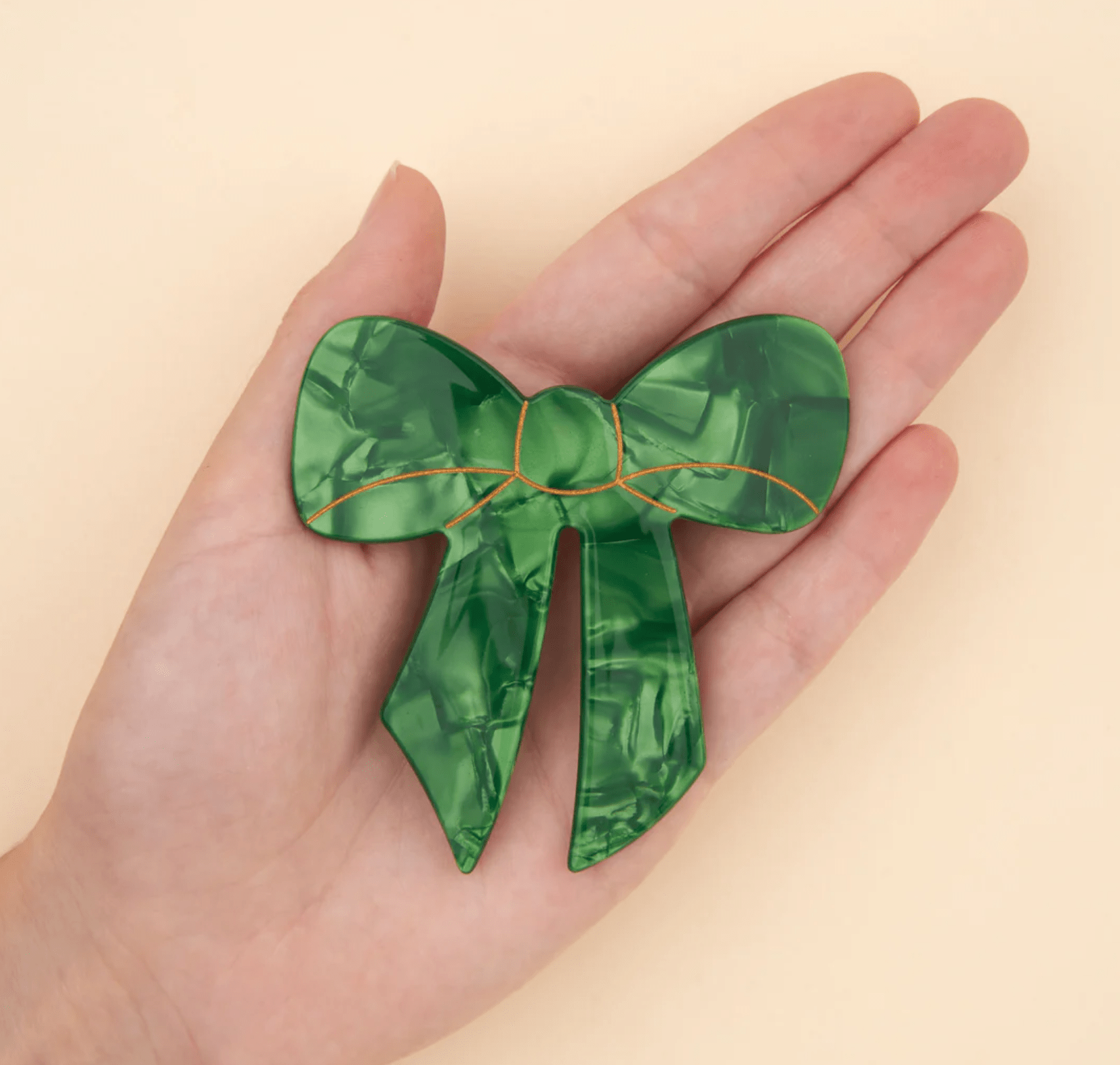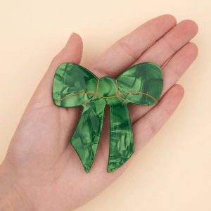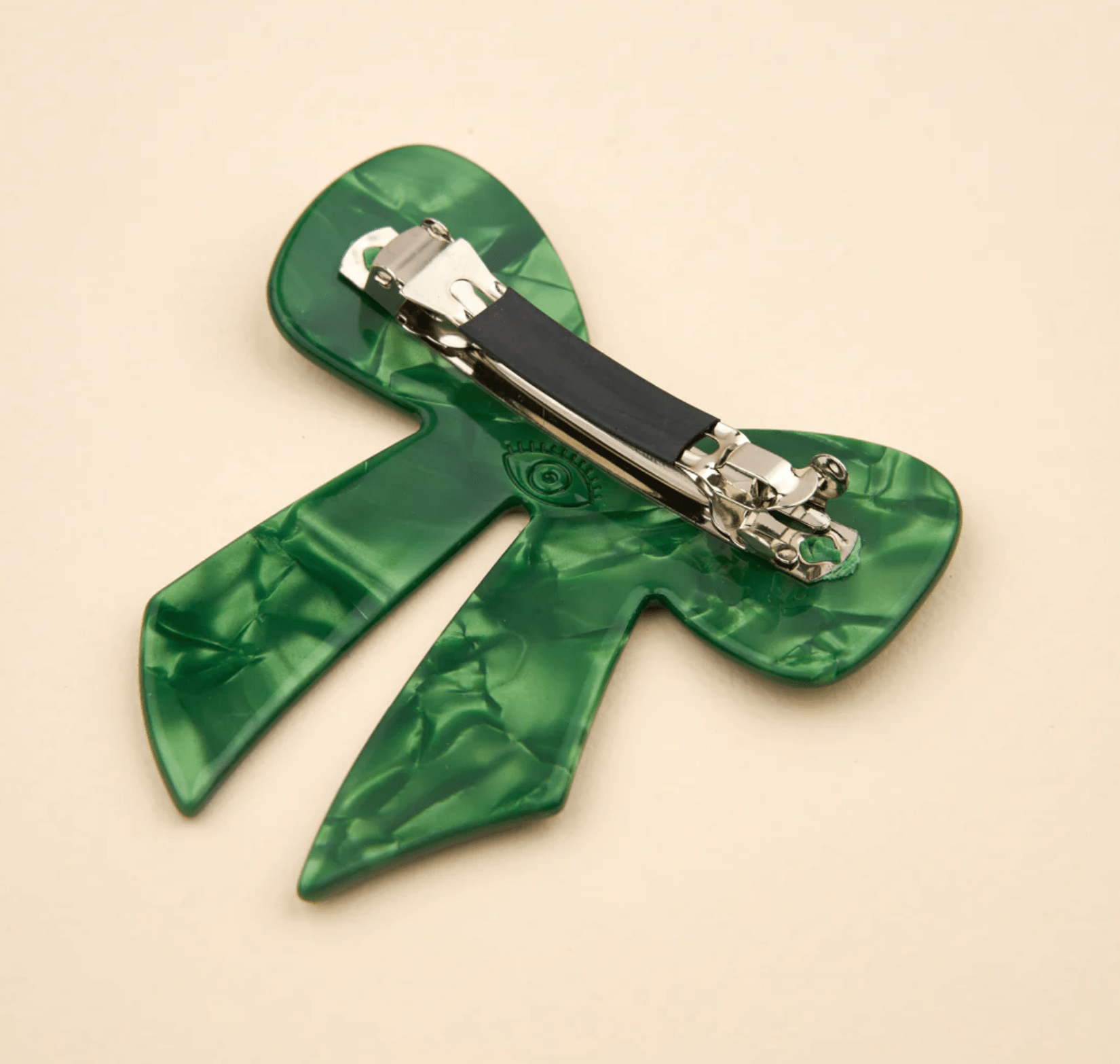Para un toque vintage y romántico, adorna tu cabello con esta hermosa horquilla con un gran lazo verde pino y detalles brillantes.