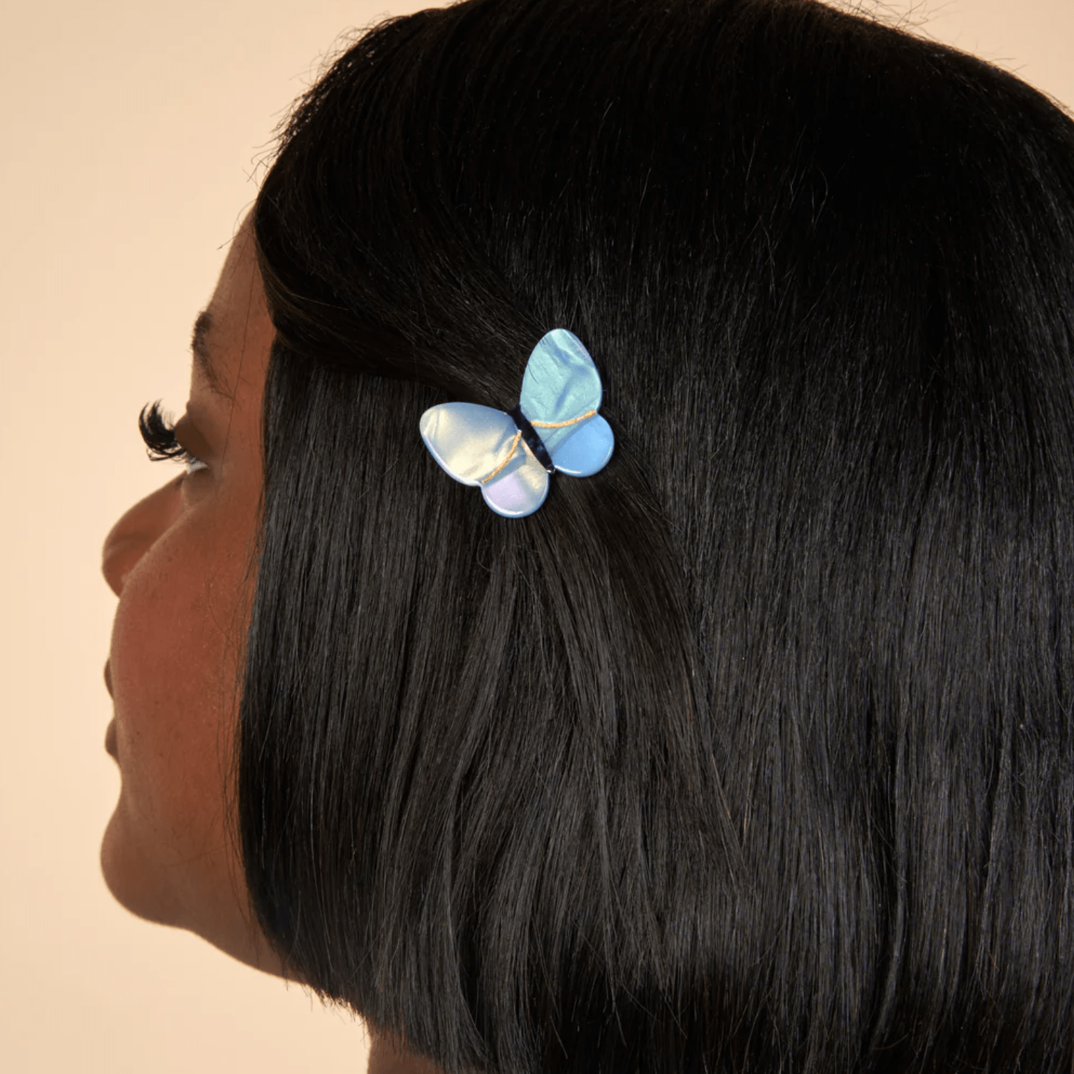 Coloca una mariposa lavanda en la goma elástica para darle un toque final precioso. Esta pinza para el cabello, única y brillante, es como una pequeña joya retro que le dará un toque de alegría a tu peinado.