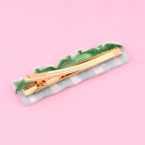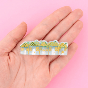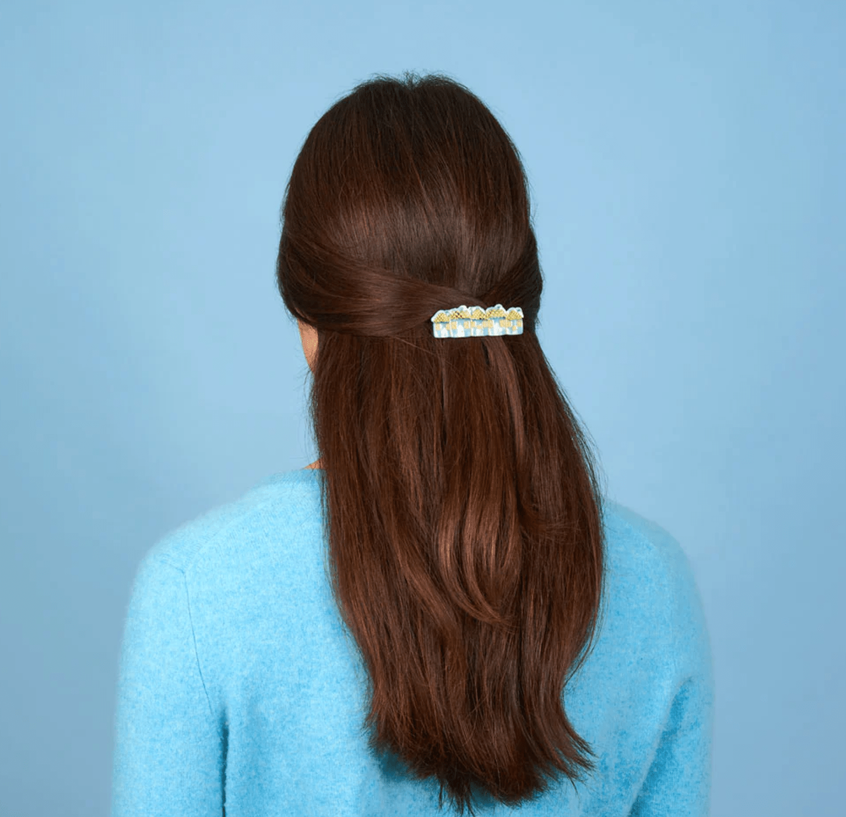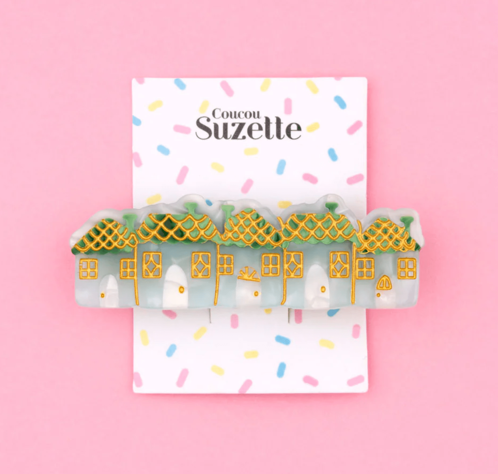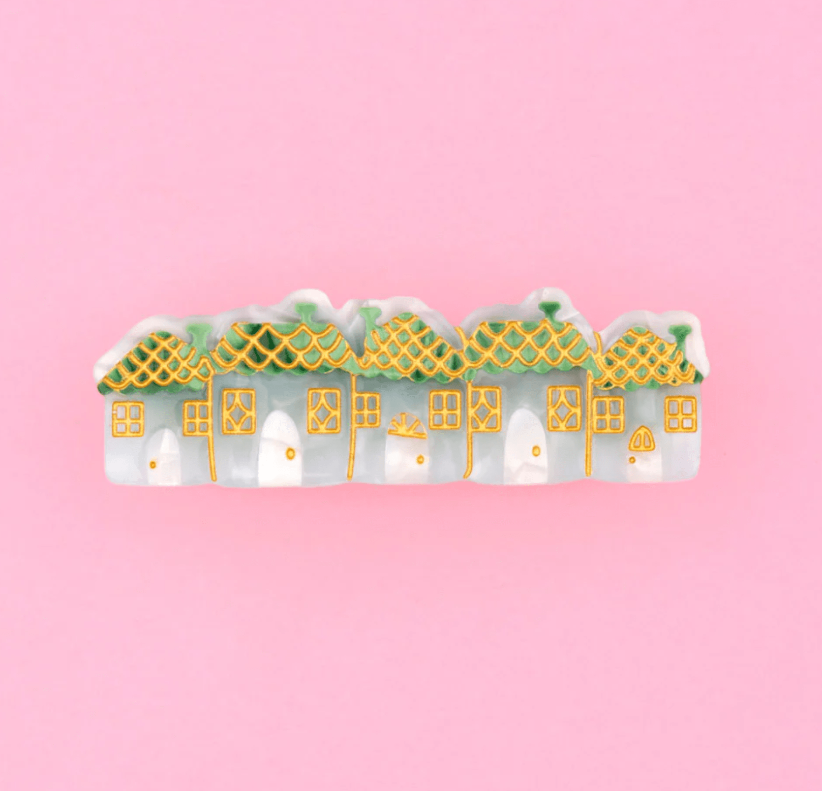 Una adorable pinza para el pelo con forma de pueblecito nevado, con casitas que parecen intentar darse calor unas a otras.