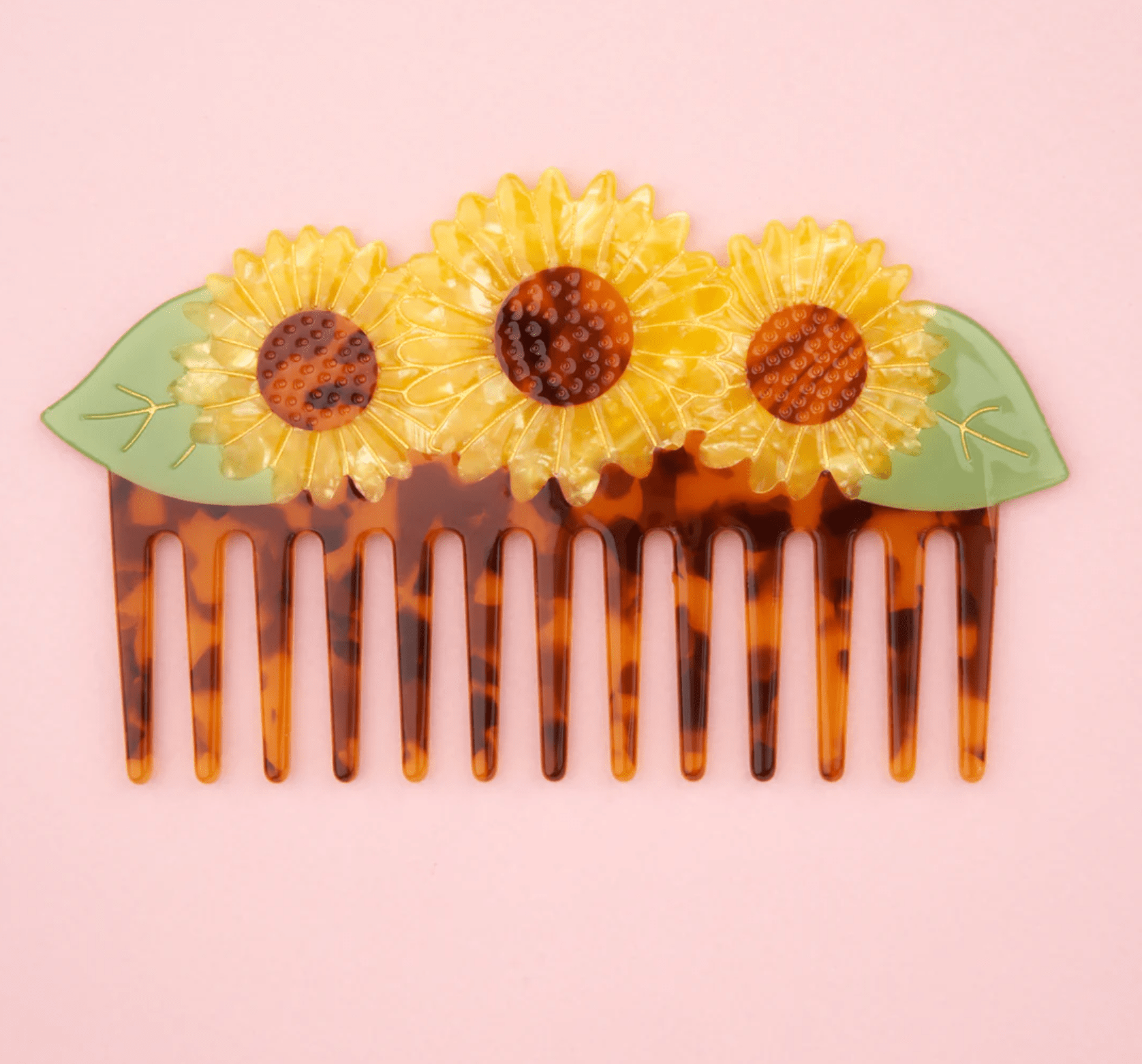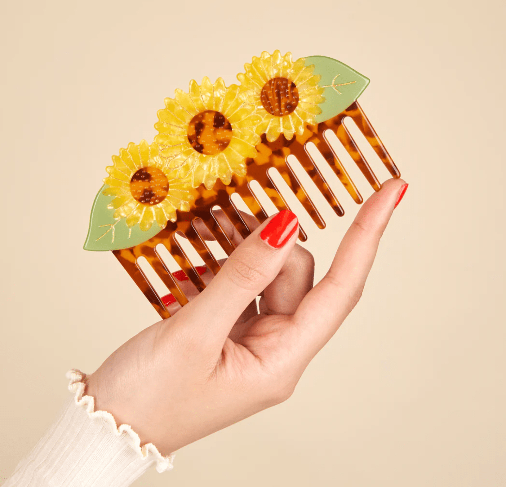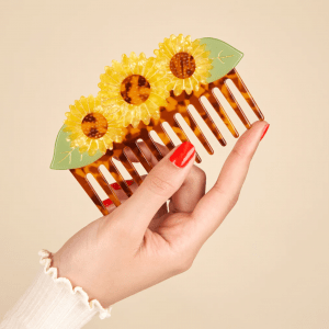 Para empezar el día con buen pie, nos peinamos con este precioso peine de girasol. Un trío de flores radiantes, inspirado en la inigualable pinza de girasol , ¡listas para desenredar nuestras melenas como nadie!