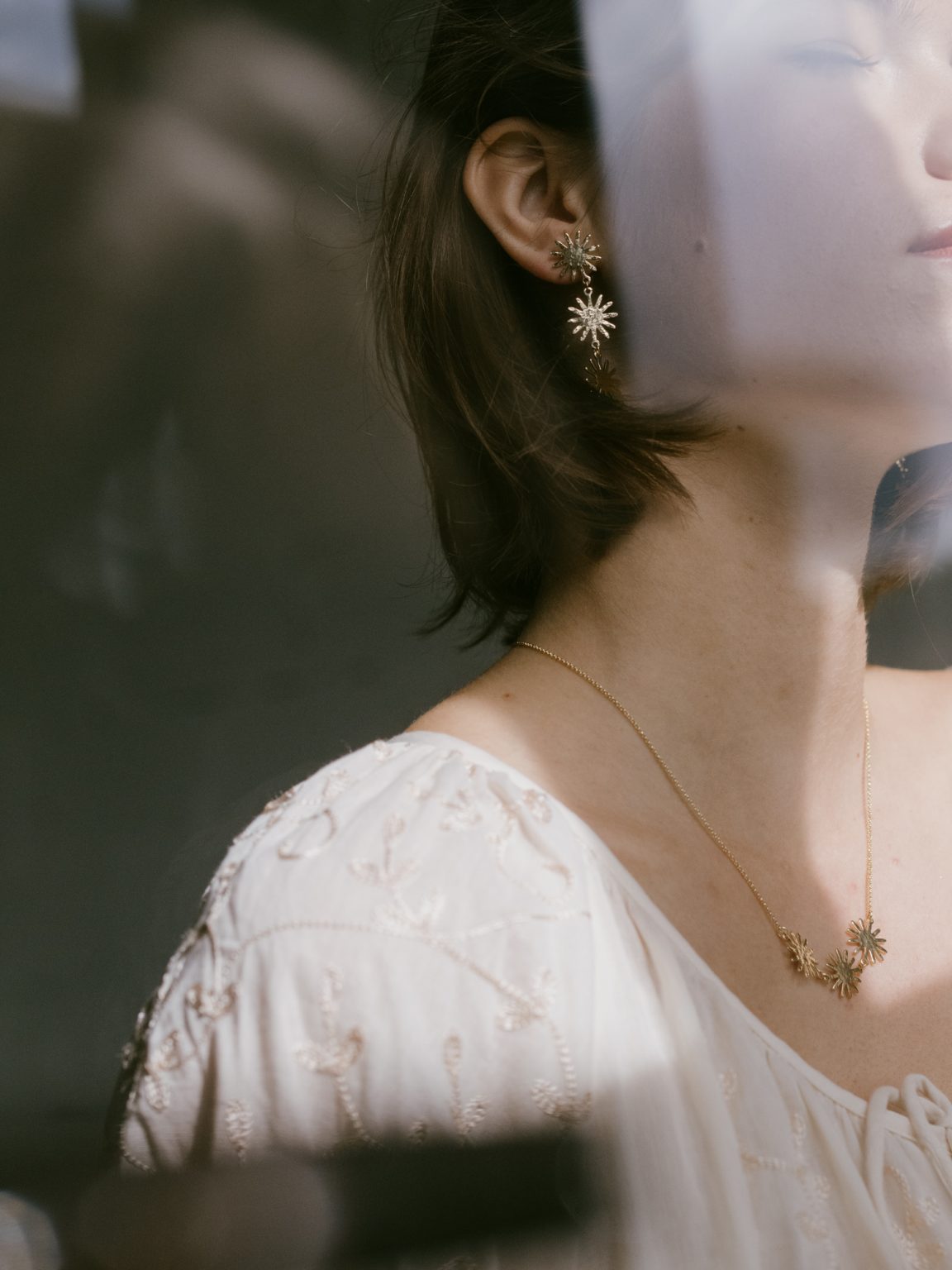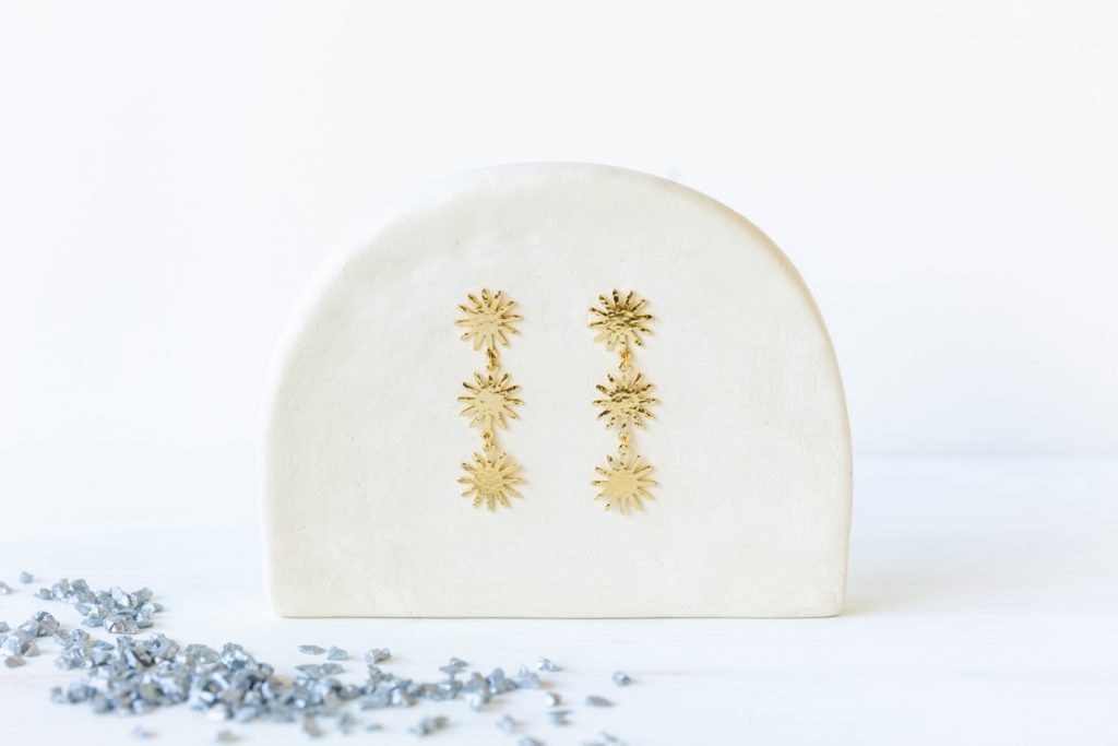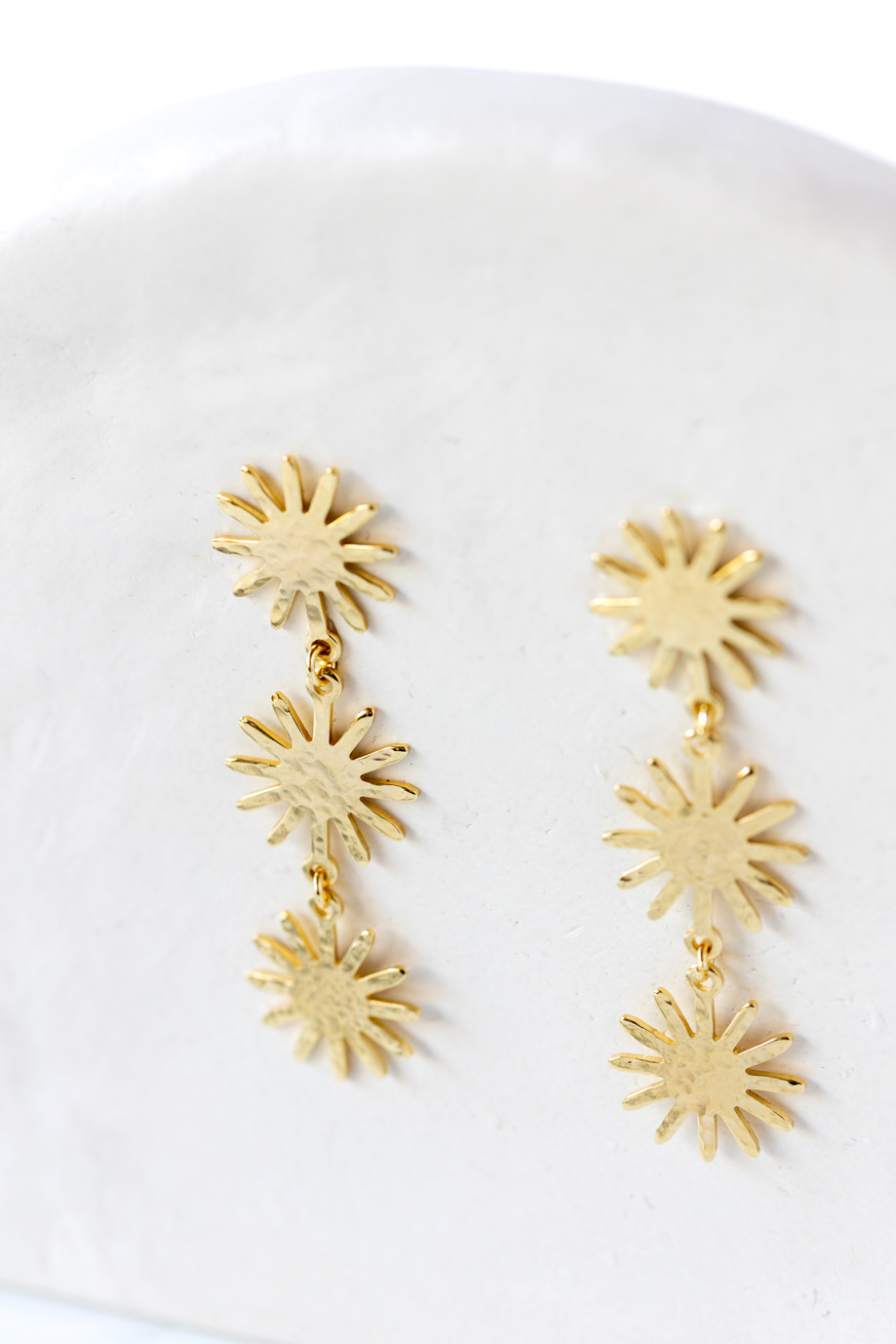 Amanecer son unos bellos pendientes largos con tres soles dorados, una pieza luminosa que nos recuerda que la luz siempre regresa, un pequeño amuleto lleno de luz para los tiempos oscuros.