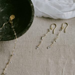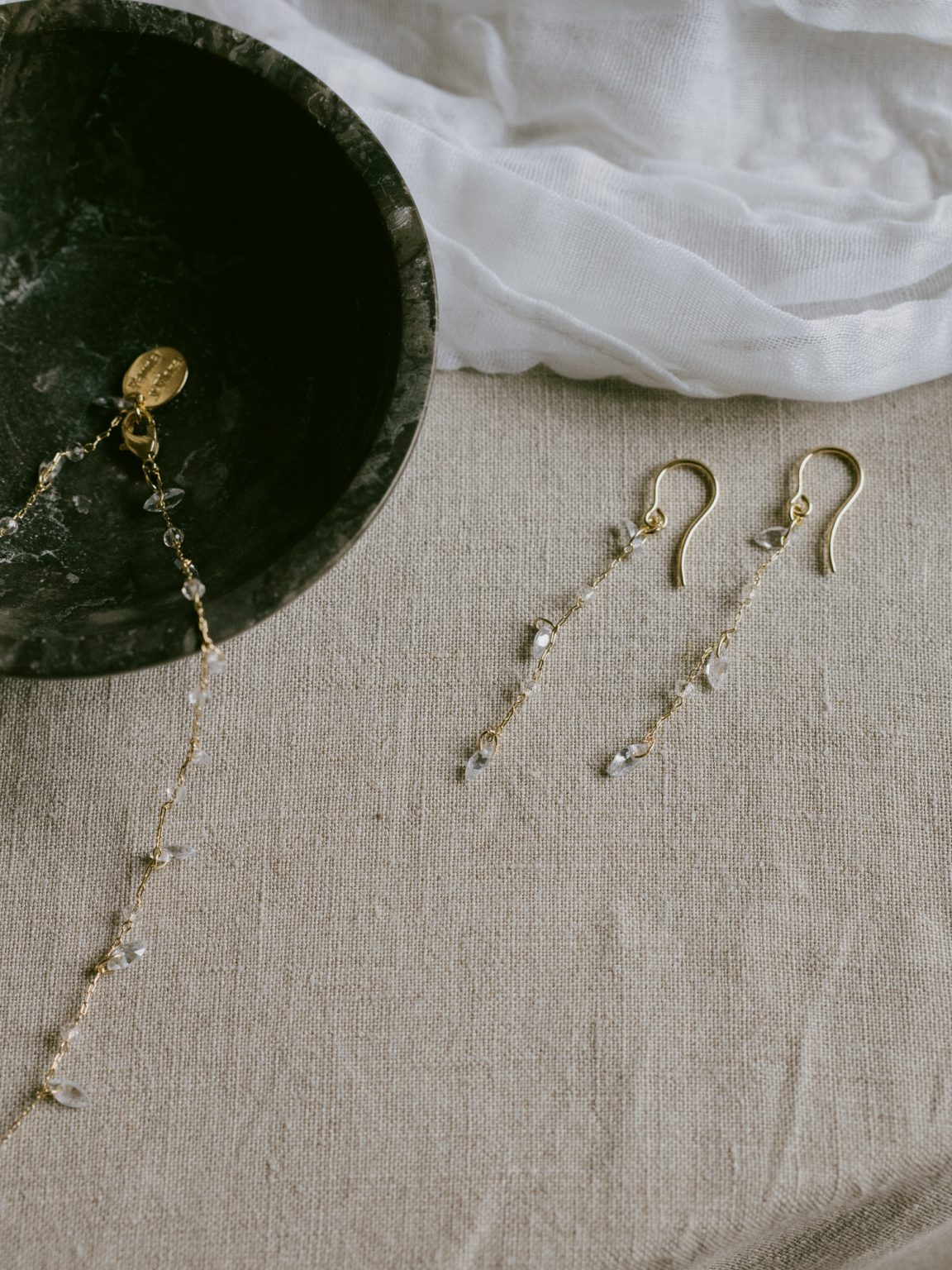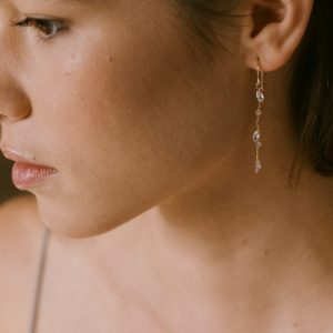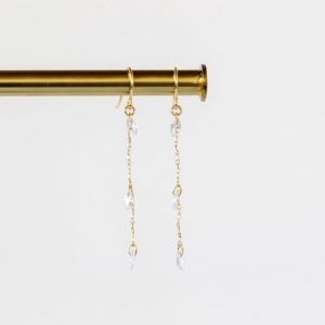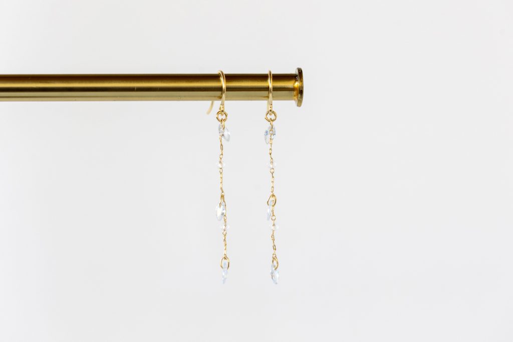 Nuestros pendientes Duermevela son una pieza fina y delicada, unos pendientes largos dorados de los que penden diminutas lágrimas y cuentas de circonitas que reflejan la luz.