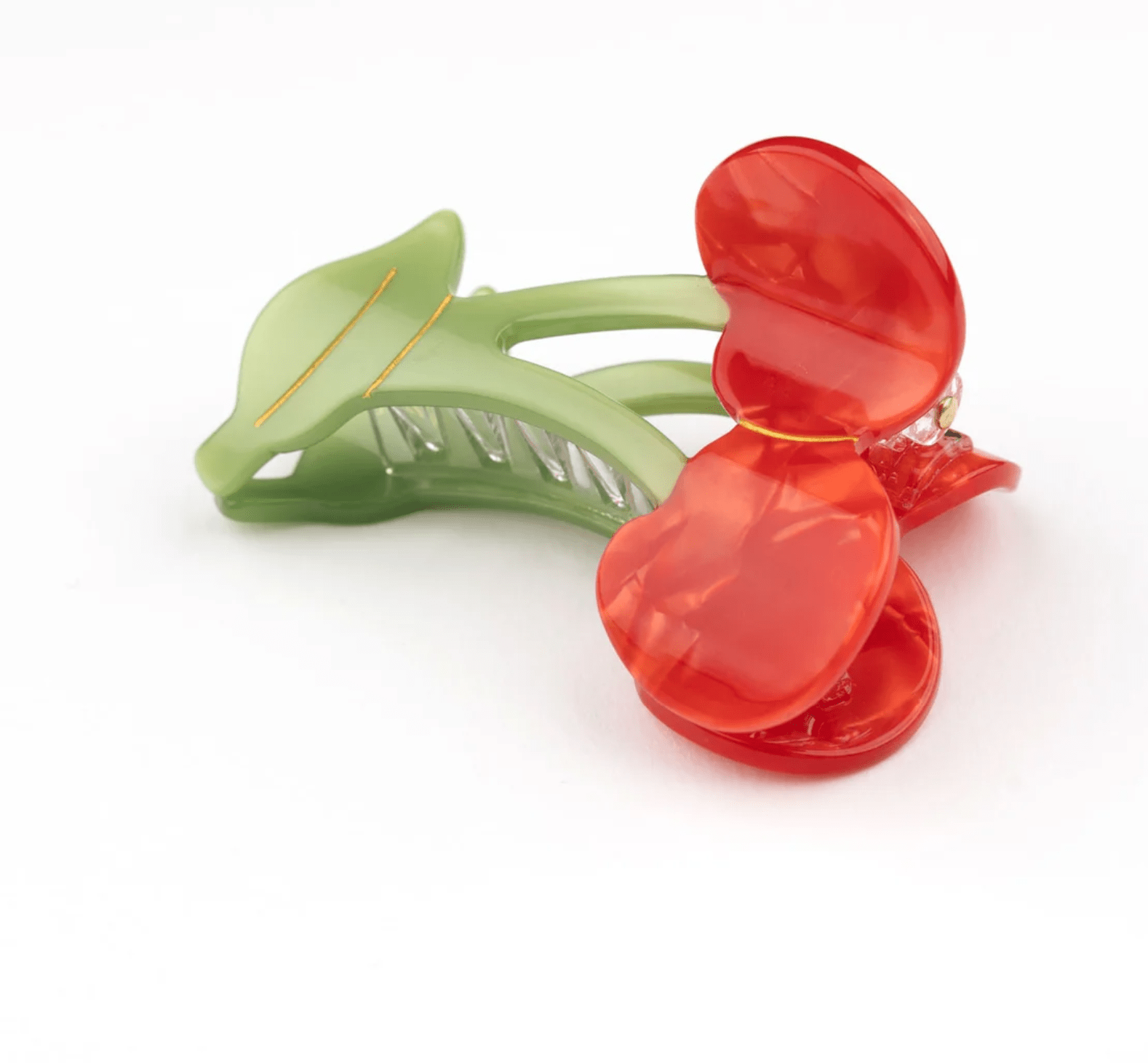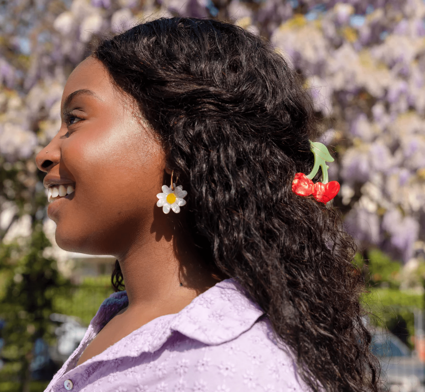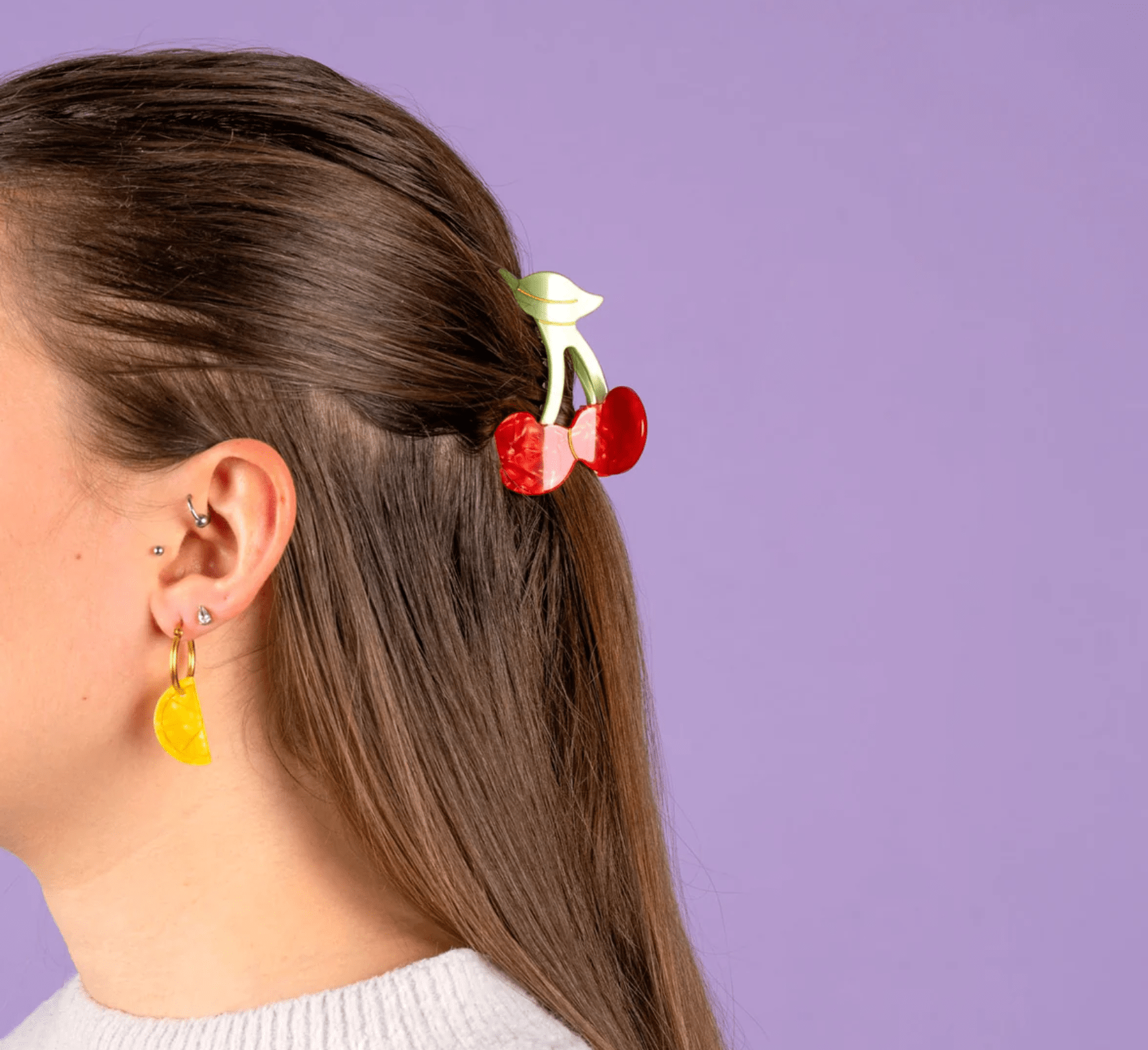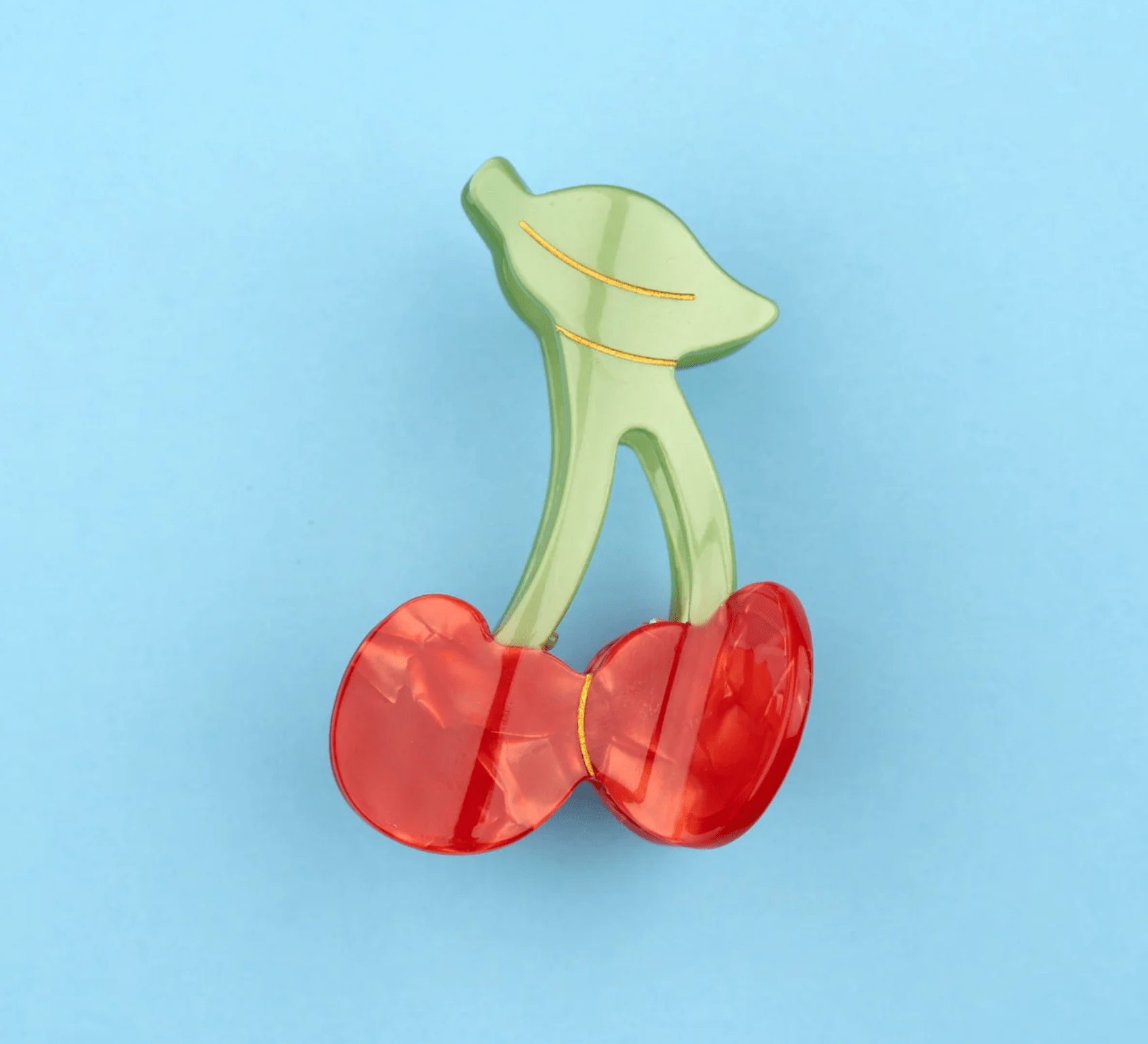 Un bonito par de cerezas en la parte superior de la cabeza a modo de pinza para el cabello, con un delicioso espíritu retro que nos encanta.