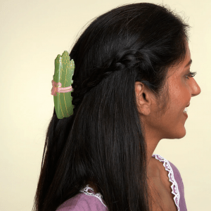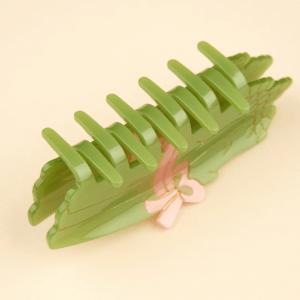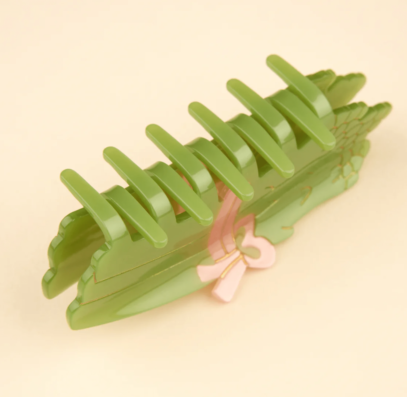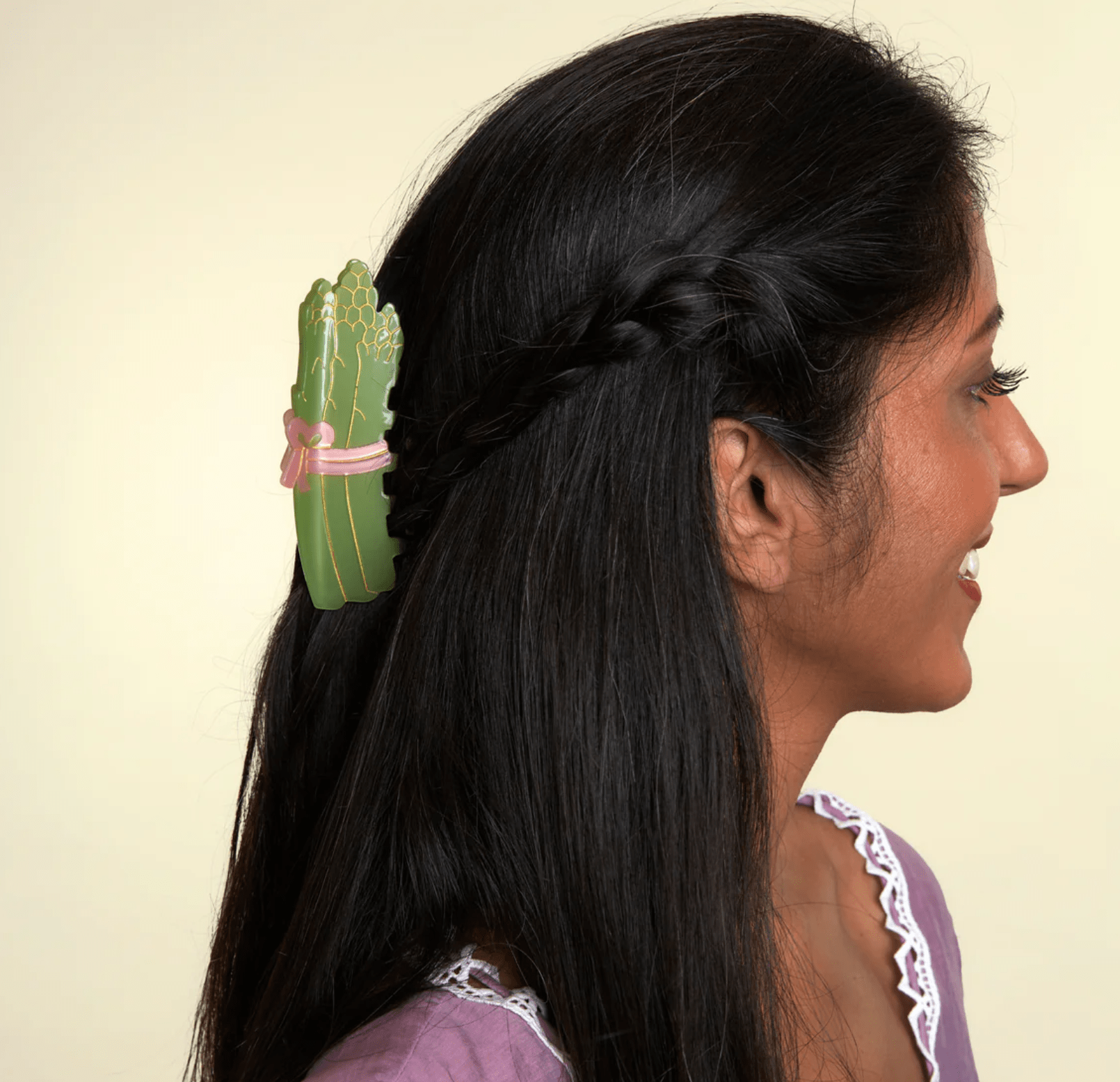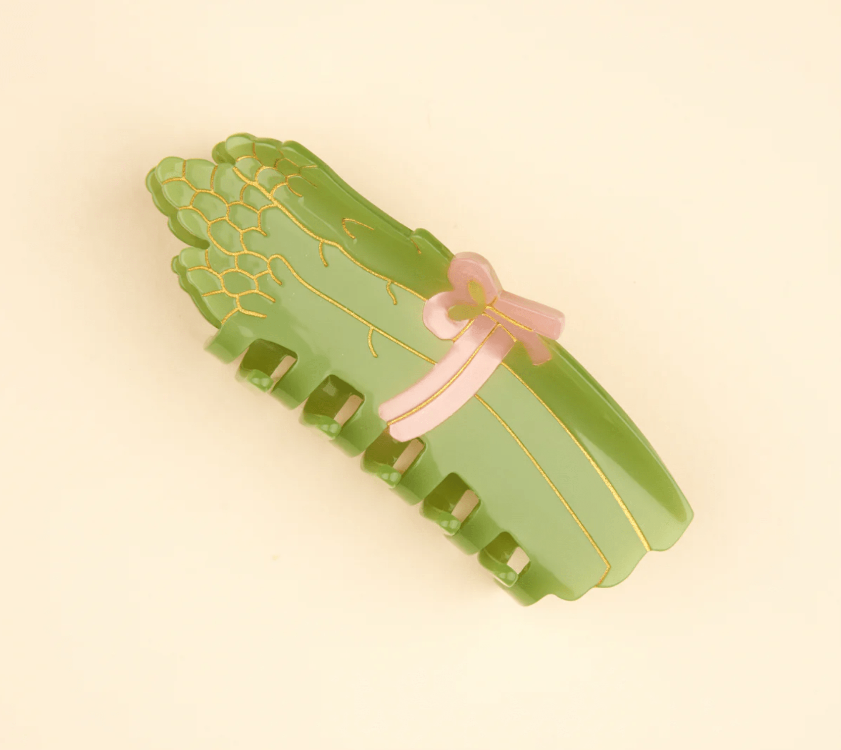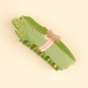 Ya sea que vayas al mercado dominical o a cuidar tu huerto, ¡opta por la pinza de espárragos! Tres pequeños espárragos atados con un precioso lazo rosa, listos para revelar nuestro rostro con frescura y ligereza. Este original accesorio sujeta a la perfección moños banana y medias coletas, tanto para cabello fino como grueso.