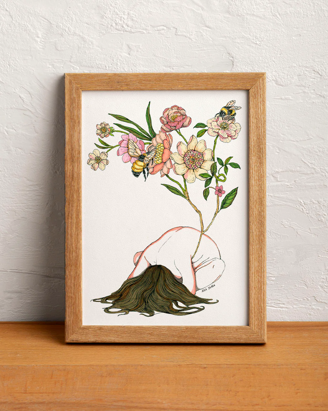 Abejas y flores es una dulce y vibrante ilustración de la artista española Ana Jarén, que representa una escena llena de encanto: una composición formada por flores en plena floración, rodeada de abejas que zumban en armonía juguetona. Esta ilustración colorida y reflexiva es ideal como elemento de decoración tanto para espacios animados como para rincones contemplativos.
