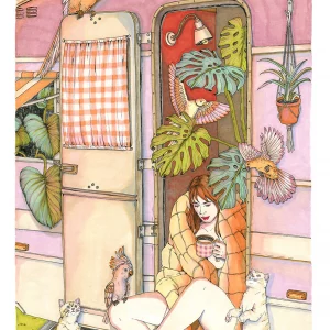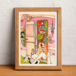 Esta encantadora ilustración de la artista española Ana Jarén presenta una escena llena de fantasía titulada Chica de la caravana. Realizada con su característico estilo de dibujo a mano, la obra muestra a una joven junto a una colorida caravana, rodeada de exuberantes motivos decorativos que evocan una narrativa visual y la imaginación cotidiana. La composición combina alegres patrones con tonos vibrantes, convirtiéndola en una pieza llamativa, ideal para decorar cualquier pared.
